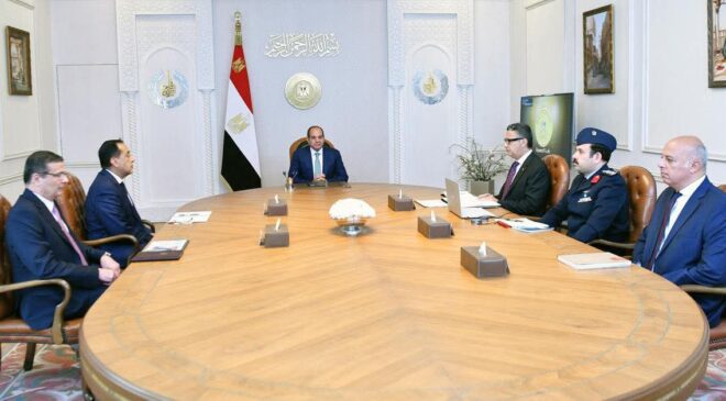 اجتماع الرئيس السيسي مع رئيس الوزراء ووزير التموين والتجارة الداخلية ووزيرالزراعة لمتابعة منظومة الأمن الغذائي وإنتاج وتوزيع السلع الاستراتيجية لضمان وجود مخزون آمن لمدد زمنية مطمئنة