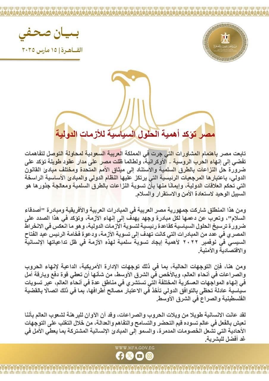تابعت مصر باهتمام المشاورات التي جرت في المملكة العربية السعودية لمحاولة التوصل لتفاهمات تفضي إلى إنهاء الحرب الروسية – الأوكرانية، ولطالما ظلت مصر على مدار عقود طويلة تؤكد على ضرورة حل النزاعات بالطرق السلمية والاستناد إلى ميثاق الأمم المتحدة ومختلف مبادئ القانون الدولي، باعتبارها المرجعيات الرئيسية التي يرتكز عليها النظام الدولي والمبادئ الأساسية الراسخة التي تحكم العلاقات الدولية، وإيمانًا منها بأن تسوية النزاعات بالطرق السلمية ومعالجة جذورها هو السبيل الوحيد لاستعادة الأمن والاستقرار والسلام.