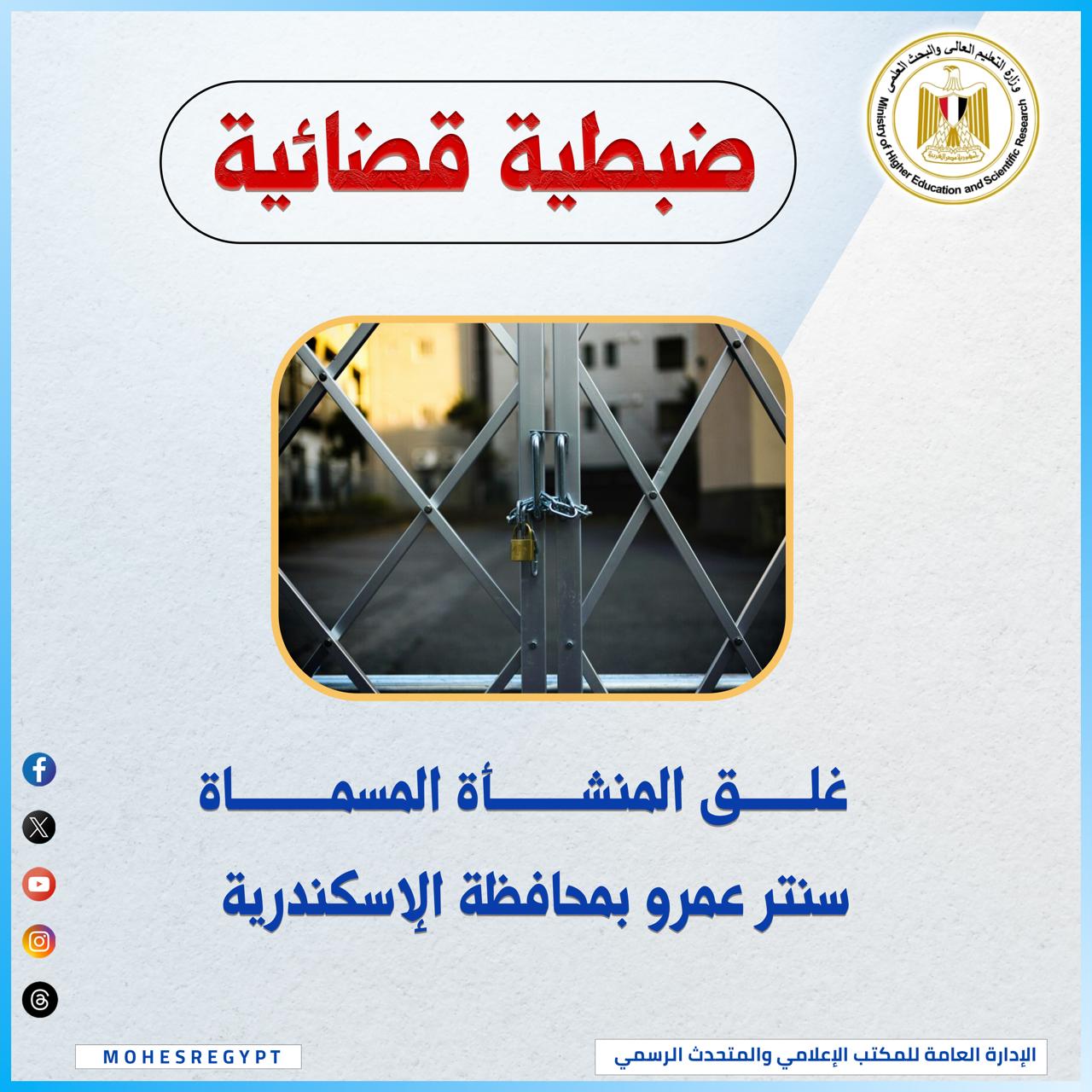 كما أصدر الدكتور أيمن عاشور، قرارًا بغلق المنشأة المسماة “سنتر عمرو”، والكائنة في (شارع زكريا غنيم – عمارة رقم 109 – الدور الأرضي – محافظة الإسكندرية)، لقيامها بإدارة وتسهيل عملية إعطاء دروس خصوصية لطلاب المعاهد الفنية التابعة لوزارة التعليم العالي، نظير مبالغ مالية.