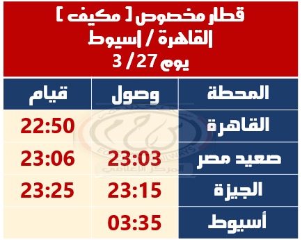 – تشغيل قطار مخصوص مكيف ( القاهرة / أسيوط ) حيث يقوم من القاهرة الساعة 22:50 ويصل أسيوط الساعة 03:35 طبقاً للجدول المرفق .