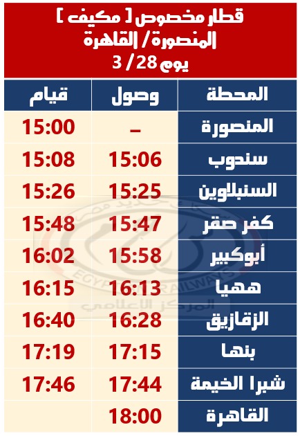 – تشغيل قطار مخصوص مكيف ( المنصورة / الزقازيق / بنها / القاهرة ) حيث يقوم من المنصورة الساعة 15:00 ويصل القاهرة الساعة 18:00 طبقاً للجدول المرفق .