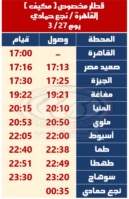– تشغيل قطار مخصوص مكيف ( القاهرة / نـجع حمادى ) حيث يقوم من القاهرة الساعة 17:00 ويصل نـجع حمادى الساعة 00:35 صباح اليوم التالى طبقاً للجدول المرفق .