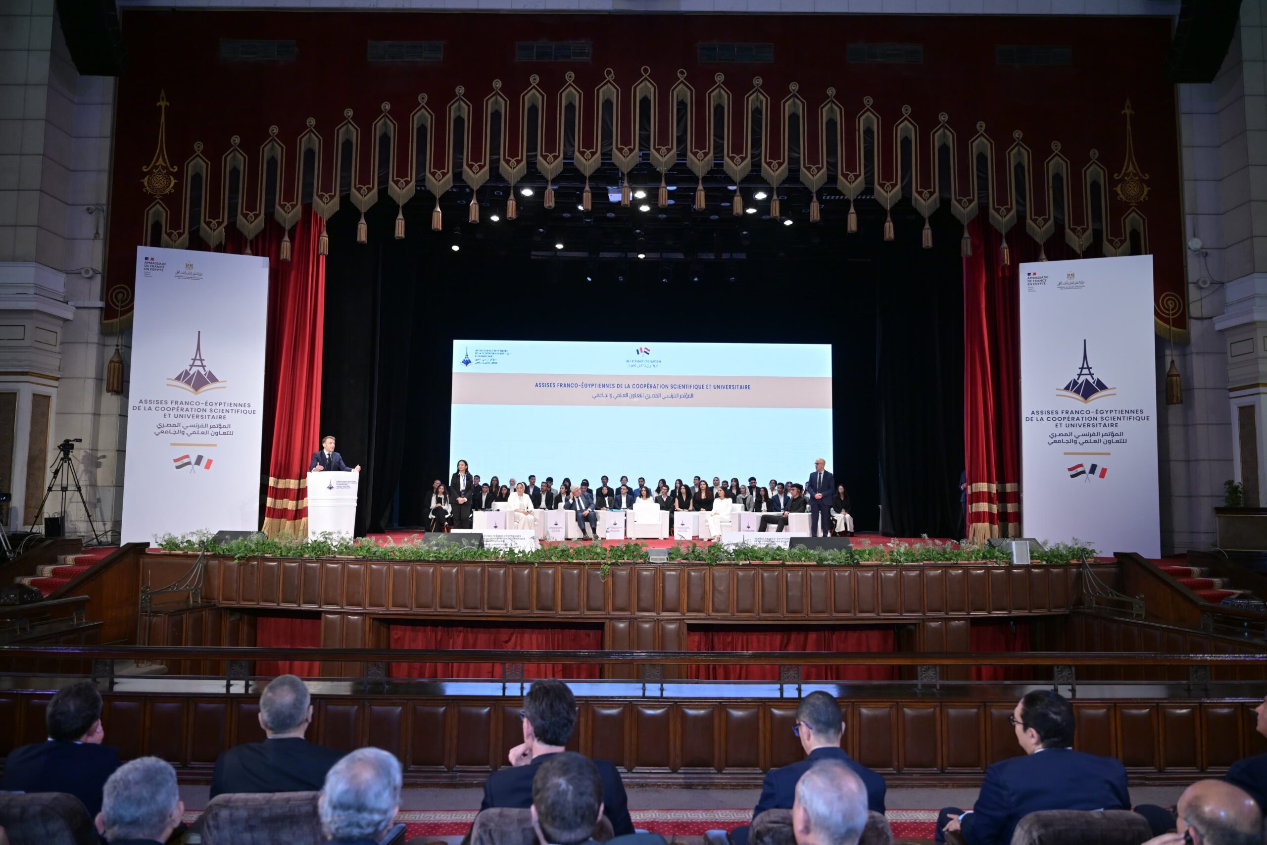 وأعرب الرئيس ماكرون في كلمته التي ألقاها بقاعة الاحتفالات الكبرى عن تقديره العميق للعلاقات التاريخية التي تربط بين مصر وفرنسا، مؤكدًا على أن الشباب والابتكار هما مفتاح المستقبل المشترك بين البلدين، ومشيدًا بالدور الرائد الذي تلعبه جامعة القاهرة كمؤسسة تعليمية عريقة على مستوى المنطقة.