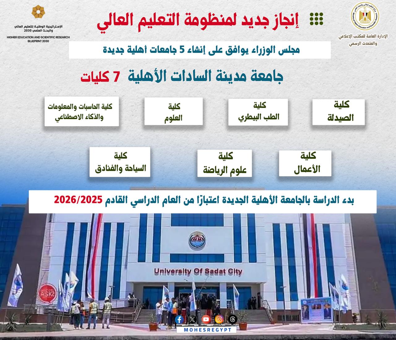 وفي هذا السياق، نُسلّط الضوء اليوم على جامعة مدينة السادات الأهلية، التي تمت الموافقة على مشروع قرار رئيس الجمهورية بإنشائها، ومقرها محافظة المنوفية، وذلك ضمن خطة الدولة للتوسع في إنشاء الجامعات الأهلية على مستوى الجمهورية، وتعزيز دورها في تطوير التعليم والبحث العلمي، وتوفير التخصصات العلمية التي تواكب متطلبات سوق العمل.