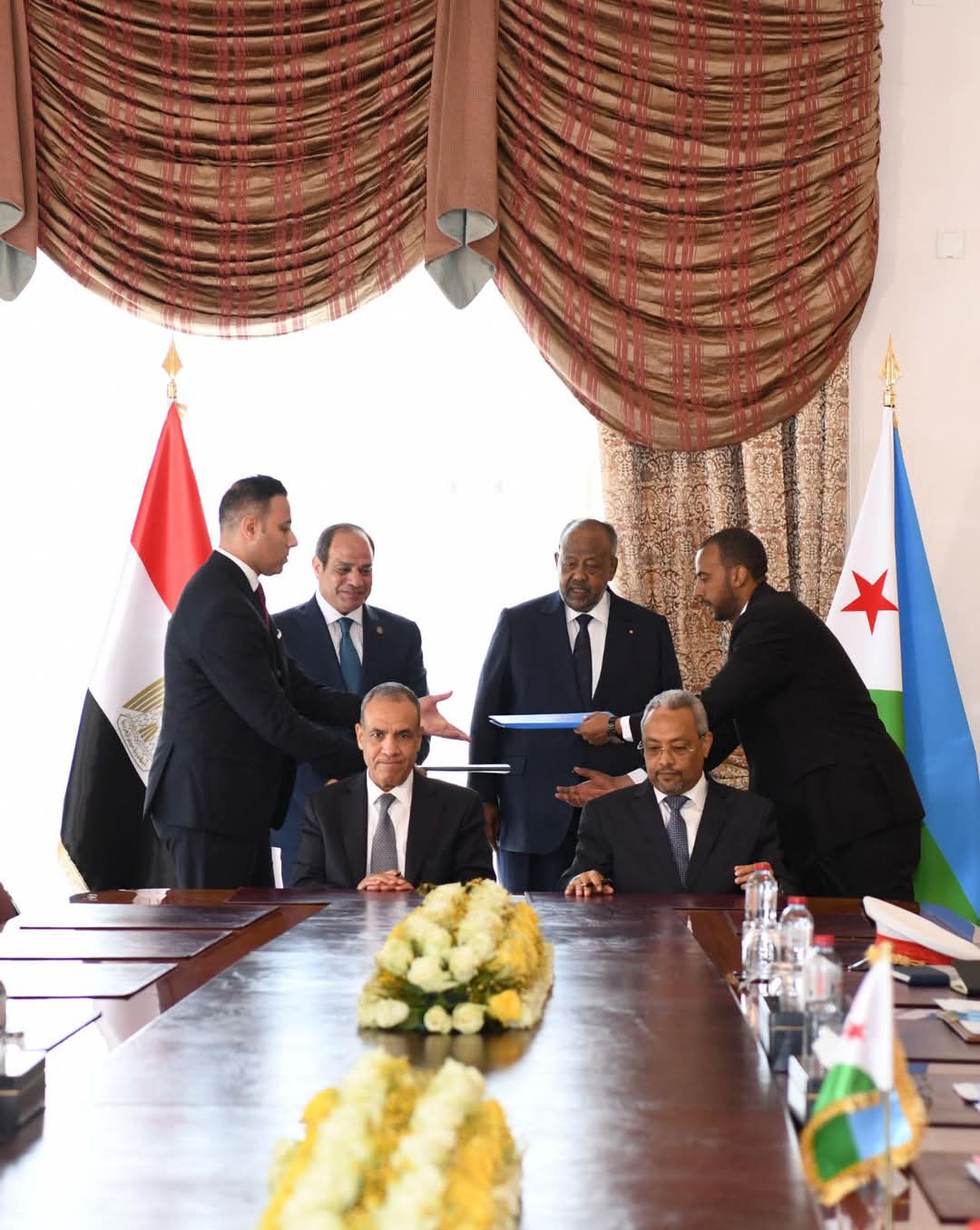 وفى هذا السياق، يسعدنى الإعلان عن تأسيس “مجلس الأعمال المصرى الجيبوتى المشترك” .. كما اتفقنا على تدشين مقر بنك “مصر – جيبوتى” فى غضون الأيام المقبلة .. ووجهنا بمراجعة الأطر التعاهدية السابقة، ذات الصلة بتنمية وحماية الاستثمارات بين البلدين.