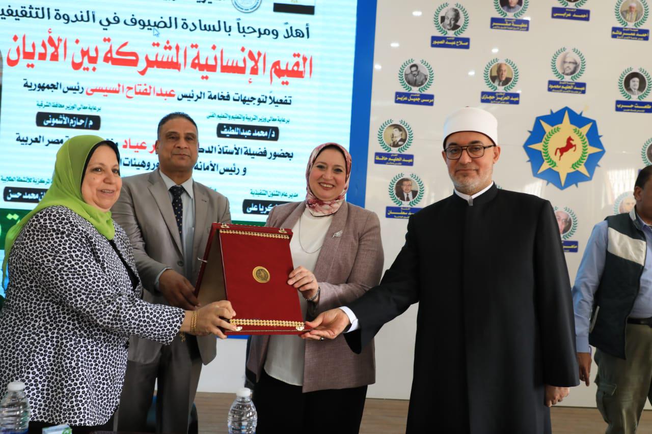 من جانبها، أكدت الدكتورة، إيمان محمد حسن، رئيس الإدارة المركزية للأنشطة الطلابية بوزارة التربية والتعليم، أن هذه اللقاءات تسهم في بناء الشخصية المتزنة للطلاب، وغرس القيم العليا في نفوسهم، مشيدة بما يقدمه فضيلة المفتي من خطاب ديني رشيد، يحترم العقل ويهذب الوجدان، كما عبّر الأستاذ عبد الرحمن عبد اللطيف، وكيل مديرية التربية والتعليم بمحافظة الشرقية، عن شكره وتقديره لزيارة فضيلة المفتي، موضحًا أن الندوة تمثل إضافة نوعية في مسار العملية التعليمية والتربوية، وتعزز من جهود بناء وعي طلابي مستنير، كما حضر اللقاء فضيلة الشيخ، السيد الجنيدي، رئيس الإدارة المركزية لمنطقة الشرقية الأزهرية، وفضيلة الدكتور،خالد محمد عطية، مدير عام الإرشاد الديني بمديرية أوقاف الشرقية.