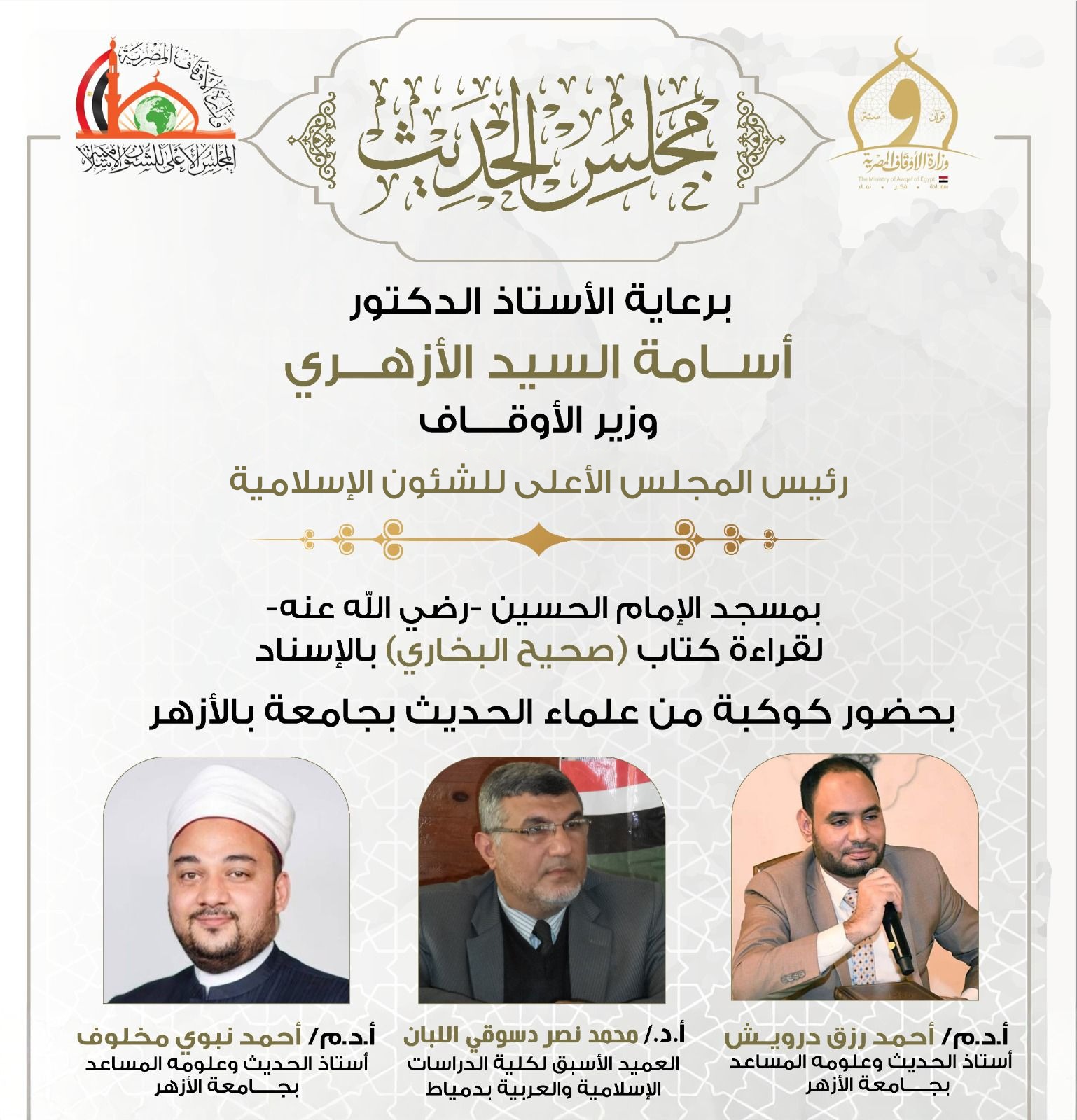 ينعقد غدًا الأربعاء الموافق ٧ من مايو ٢٠٢٥م، المجلس الثامن والأربعون؛ لقراءة صحيح الإمام البخاري بالسند المتصل عقب صلاة العصر، في رحاب مسجد الإمام الحسين ـرضي الله عنه- بالقاهرة، وذلك برعاية كريمة من معالي الأستاذ الدكتور أسامة الأزهري وزير الأوقاف؛ وإشراف فضيلة الأستاذ الدكتور محمد عبد الرحيم البيومي، الأمين العام للمجلس الأعلى للشئون الإسلامية. ويضم المجلس نخبة من علماء الحديث بجامعة الأزهر، منهم: فضيلة الأستاذ الدكتور محمد نصر اللبان، أستاذ الحديث وعلومه؛ وفضيلة الأستاذ الدكتور أحمد رزق درويش، أستاذ الحديث وعلومه المساعد؛ وفضيلة الأستاذ الدكتور أحمد نبوي مخلوف، أستاذ…