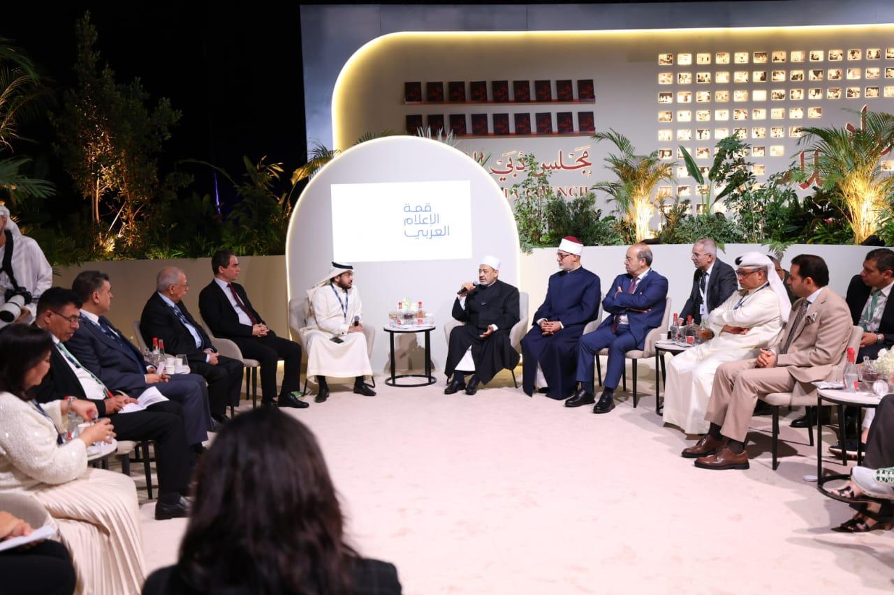 عقد فضيلة الإمام الأكبر الأستاذ الدكتور أحمد الطيب، شيخ الأزهر الشريف رئيس مجلس حكماء المسلمين، جلسة نقاشيَّة مفتوحة مع عددٍ من أبرز الإعلاميين في العالم العربي، وذلك على هامش مشاركة فضيلته في قمة الإعلام العربي بدبي، التي انعقدت خلال الفترة من 25 : 27 مايو الجاري.