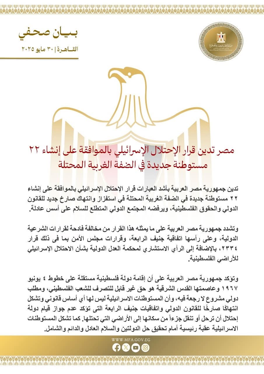 تدين جمهورية مصر العربية بأشد العبارات قرار الإحتلال الإسرائيلي بالموافقة على إنشاء ٢٢ مستوطنة جديدة في الضفة الغربية المحتلة في استفزاز وانتهاك صارخ جديد للقانون الدولي والحقوق الفلسطينية، ويرفضه المجتمع الدولي المتطلع للسلام على أسس عادلة.