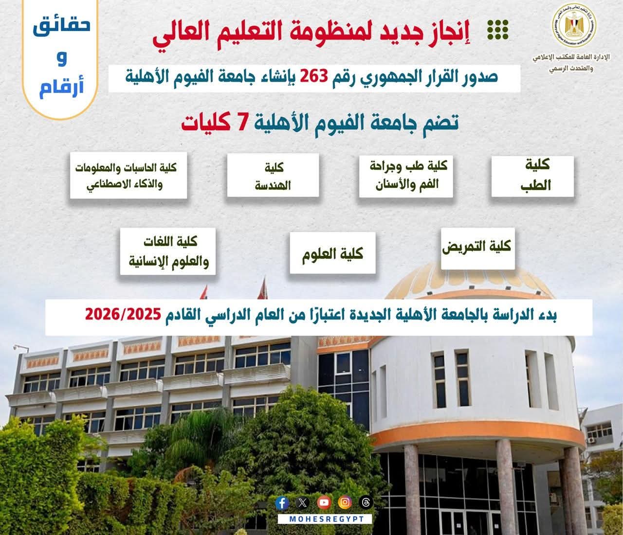وزارة التعليم العالى : حقائق وأرقام (12) جامعة الفيوم الأهلية وتوسع جديد في تعليم متميز