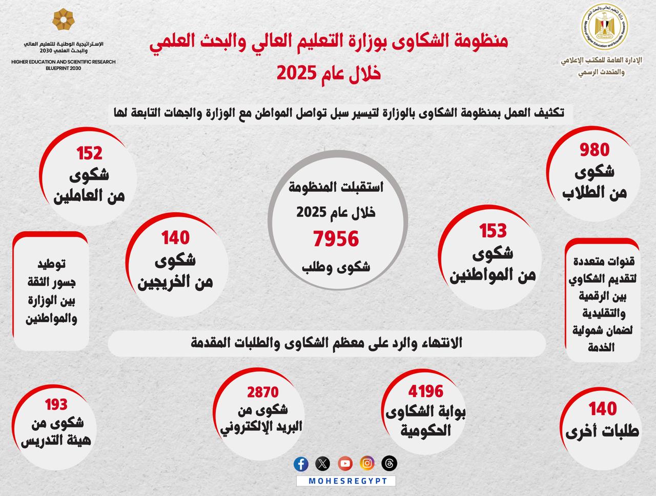 وقد بلغ عدد الشكاوي والطلبات والالتماسات الواردة من الطلاب وأولياء الأمور (980) شكوى، بينما بلغ عدد شكاوي أعضاء هيئة التدريس والمدرسين المساعدين بالجامعات والمعاهد الحكومية والخاصة نحو (193)، وبلغ عدد شكاوي العاملين بالوزارة والجامعات المصرية، نحو (152) شكوى، وبالنسبة لشكاوى الخريجين، فقد بلغ عددها (140) شكوى، وكذلك فقد تم تلقي (153) شكوى من المواطنين، هذا وقد بلغ عدد الشكاوي والاستفسارات الواردة عبر البريد الإلكتروني والبوابة الإلكترونية الخاصة بالإدارة العامة لخدمة المواطنين بموقع الوزارة، ما يقرب من (2870) شكوى، فيما بلغت الشكاوى التي تلقتها الإدارة من خلال بوابة الشكاوي الحكومية (4196) شكوى، كما تلقت الإدارة نحو (140) شكوى من خلال الوزارات والجهات الحكومية، وتم الانتهاء والرد على معظم الشكاوى والطلبات المقدمة، كما أن هناك بعض الشكاوى مازالت قيد الدراسة والمتابعة مع جهات الاختصاص سيتم الانتهاء منها والرد على مُقدميها في أقرب وقت ممكن.