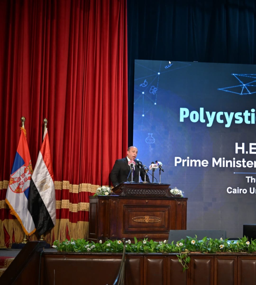 وفي بدايه كلمته، أعرب الدكتور جورو ماتسوت رئيس وزراء جمهورية صربيا، عن تقديره لجامعة القاهرة العريقة وكلية طب قصر العيني، مشيرًا إلي أن المحاضرة العلمية التي سوف يُلقيها داخل رحاب جامعة القاهرة تتناول موضوعًا بالغ الأهمية لكونه يُعاني منه كثير من السيدات علي المستوي العالمي، ويتم خلالها تبادل الرؤي والأفكار والإطلاع علي أحدث الأبحاث العلمية في مجال ” متلازمة تكيس المبايض” المرض الأكثر شيوعًا بين النساء، وعلاقتها بأمراض الغدد المختلفة خاصة في بداية العمر كالسكري و السمنة.