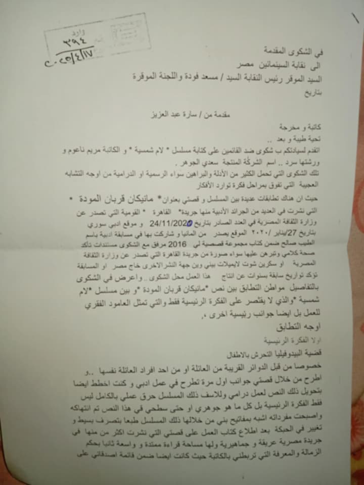 وارفقت سارة عبدالعزيز بمذكرة الشكوي المقدمة لنقيب المهن السينمائية مسعد فودة نسخة من قصتها والتي سبق أن نشرتها في جريدة القاهرة الصادرة بتاريخ يوم 24 نوفمبرعام 2020 التابعة لوزارة الثقافة المصرية ، كما نشرت القصة أيضاً في موقع كردي سوري يصدر من برلين بتاريخ 27 يناير 2020 ، وأشارت إلي أن هناك سكرين شوت لإيميلات بينها وبين جهة النشر خارج مصر ، وهي كلها تواريخ تؤكد نشر ذلك العمل قبل سنوات من إنتاجه .