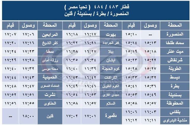 – تشغيل قطار 483 – 484 ( خدمة جديدة ) بعربات تحيا مصر بين محطتى المنصورة وقلين حيث يقوم من محطة المنصورة الساعة 15:10 ويصل محطة قلين الساعة 18:00 طبقاً للجدول المرفق .