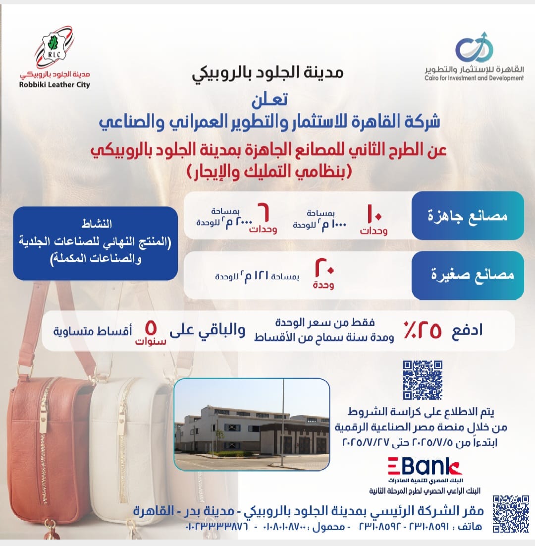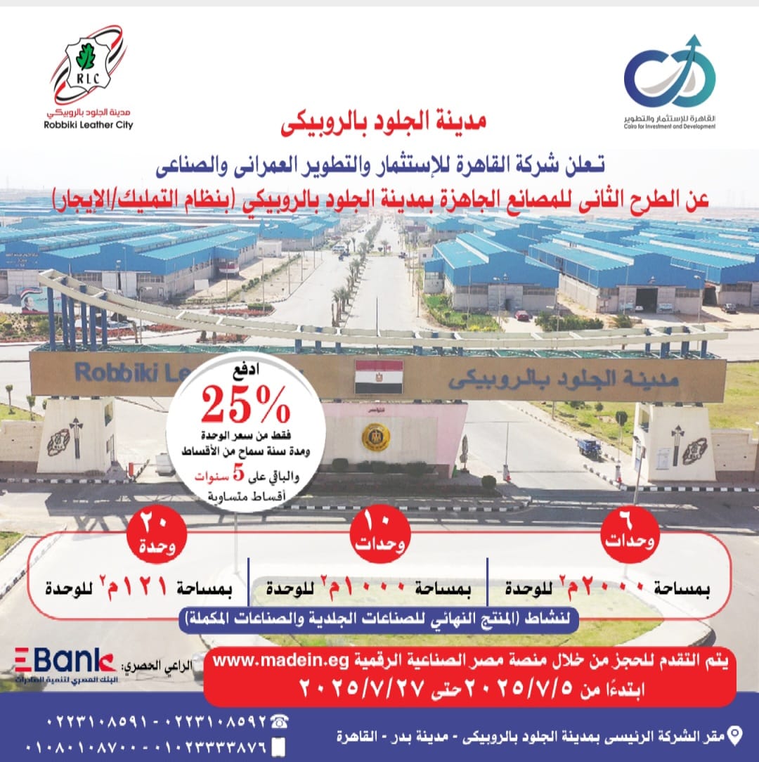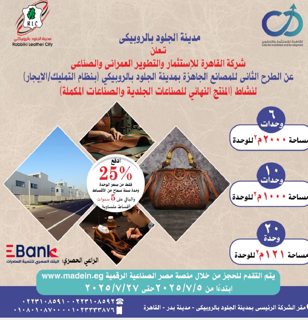 طرح 36 مصنعًا كامل التجهيزات لمنتجات الجلود تامة الصنع ضمن المرحلة الثالثة بالمدينة خلال الفترة من 5 وحتى 27 يوليو 2025 من خلال شركة القاهرة للاستثمار