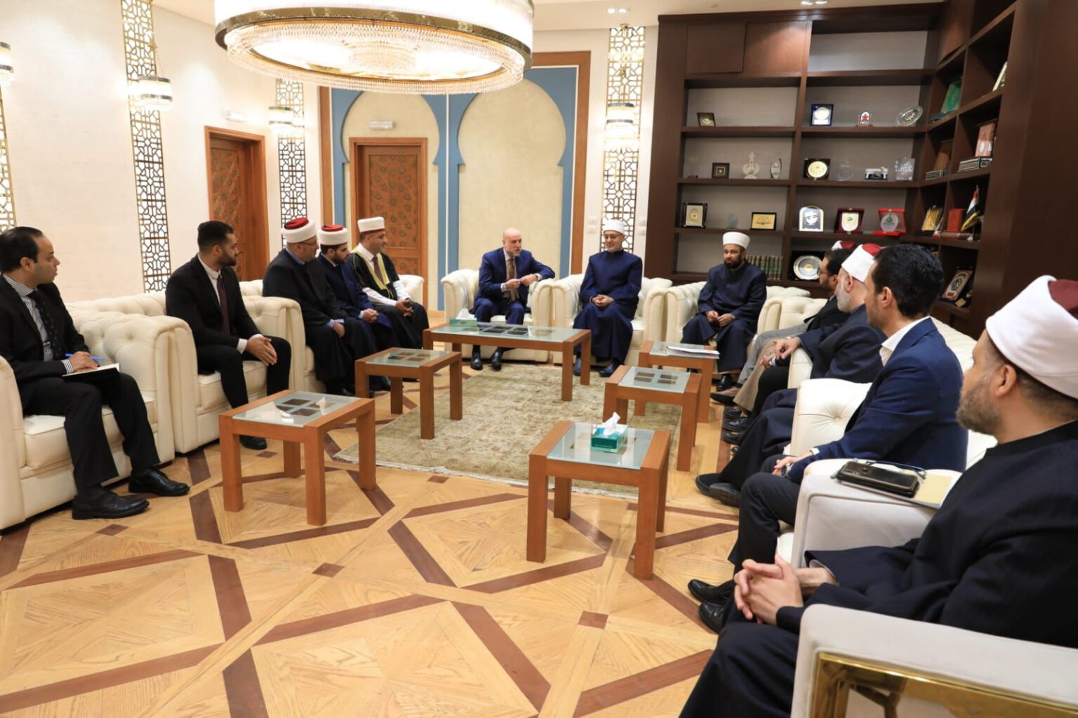 استقبل فضيلة الأستاذ الدكتور نظير محمد عياد، مفتي الجمهورية، رئيس الأمانة العامة لدور وهيئات الإفتاء في العالم، اليوم الأحد، وفدًا فلسطينيًّا رفيعًا ضمّ الدكتور محمود الهباش، قاضي قضاة فلسطين، مستشار الرئيس الفلسطيني للشؤون الدينية والعلاقات الإسلامية، والدكتور محمد مصطفى نجم، وزير الأوقاف والشؤون الدينية الفلسطيني، وعددًا من القضاة والعلماء من القدس والخليل وعدد من المدن الفلسطينية.