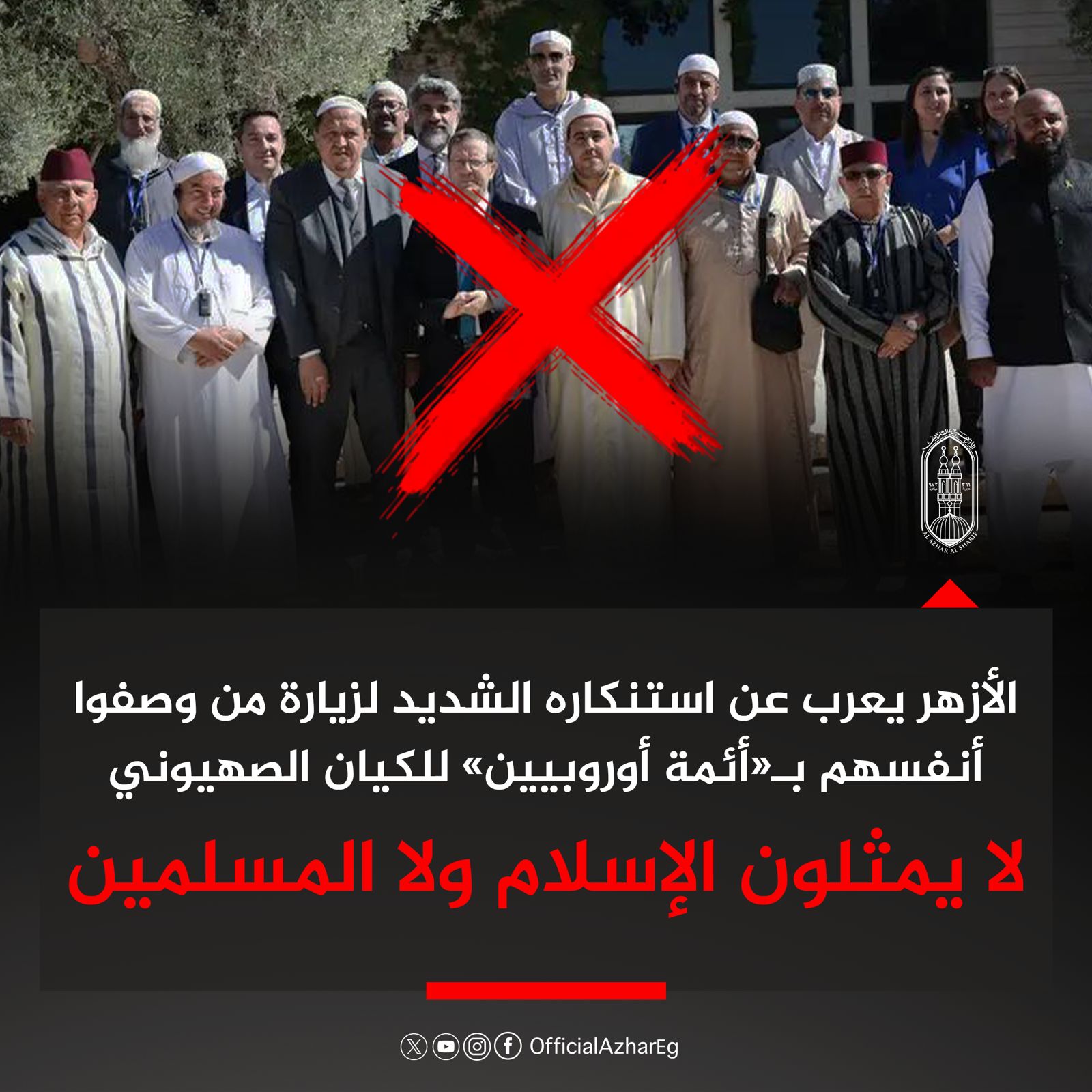 تابع الأزهر الشريف باستياء بالغ زيارة عدد ممن وصفوا أنفسهم بالأئمة الأوروبيين بقيادة المدعو حسن شلغومي، إلى الأراضي الفلسطينية المحتلة، ولقاء رئيس الكيان الصهيوني المحتل، وحديثهم المشبوه والخبيث عن أن الزيارة تهدف إلى ترسيخ «التعايش والحوار بين الأديان»، ضاربين صفحًا عن معاناة الشعب الفلسطيني من إبادة جماعية وعدوان غير مسبوق ومجازر ومذابح وقتل متواصل للأبرياء لأكثر من 20 شهرًا. ويستنكر الأزهر بشدة هذه الزيارة من هؤلاء الذين عَمِيت أبصارهم وبصائرهم، وتبلدت مشاعرهم عما يقاسيه هذا الشعب المنكوب، وكأنهم لا تربطهم بهذا الشعب أية أواصر إنسانيَّة أو دينيَّة…