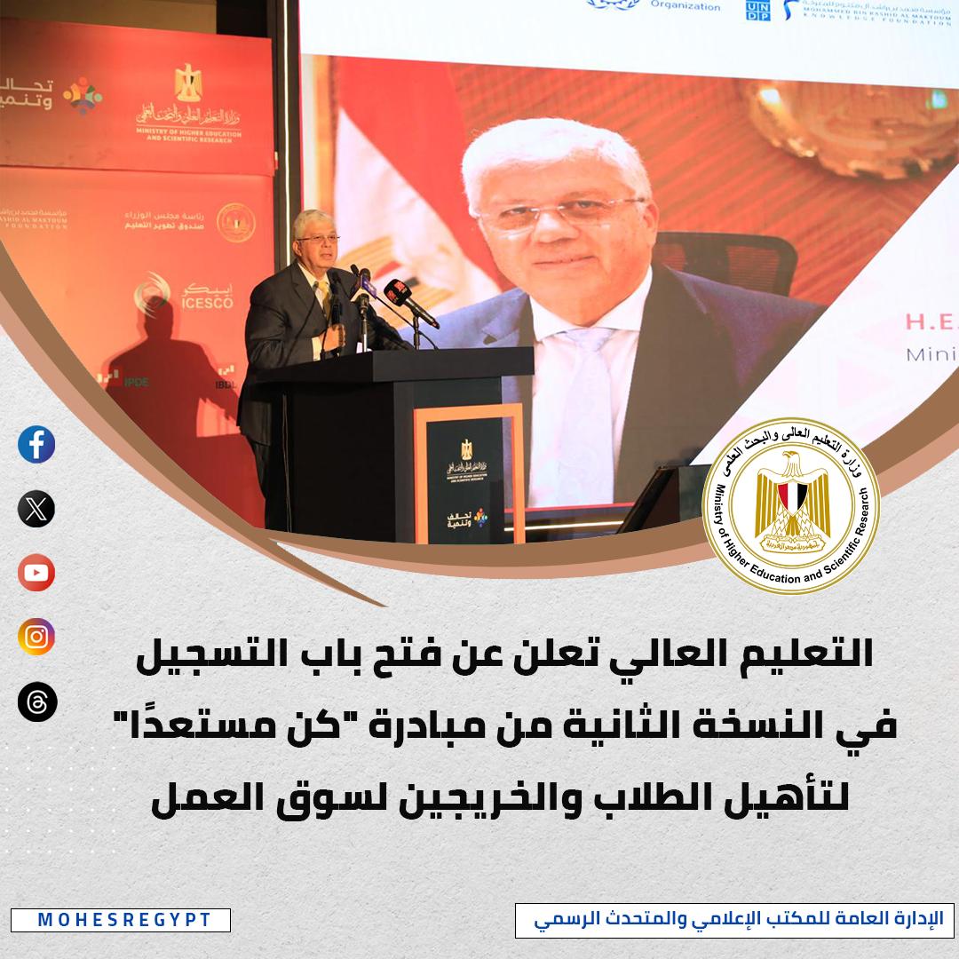 أعلنت وزارة التعليم العالي والبحث العلمي عن فتح باب التسجيل في النسخة الثانية من مبادرة “كن مستعدًا”، والتي تُعد إحدى آليات تنفيذ المبادرة الرئاسية “تحالف وتنمية”، بالشراكة مع صندوق تطوير التعليم التابع لرئاسة مجلس الوزراء، وعدد من كبرى المؤسسات الدولية، وأكد الدكتور أيمن عاشور وزير التعليم العالي والبحث العلمي أن المبادرة تهدف إلى تعزيز جاهزية طلاب السنوات النهائية وخريجي آخر ثلاث سنوات من الجامعات المصرية لمتطلبات سوق العمل محليًا وإقليميًا، من خلال تنمية المهارات التقنية والشخصية وريادة الأعمال، مشيرًا إلى أن إطلاق النسخة الثانية من مبادرة “كن مستعدًا” يأتي في إطار دعم الدولة لجهود ربط التعليم بسوق العمل، وبناء جيل من الخريجين يمتلك أدوات المنافسة والتميز في بيئات العمل الحديثة.