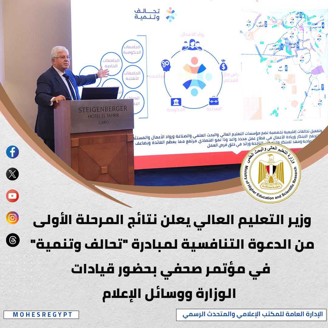 شهد د.أيمن عاشور وزير التعليم العالي والبحث العلمي، فعاليات المؤتمر الصحفي الذي أقيم للإعلان عن نتائج المرحلة الأولى للدعوة التنافسية من المبادرة الرئاسية “تحالف وتنمية”، والتي أطلقتها الوزارة في فبراير 2025؛ باعتبارها أول مبادرة وطنية تنافسية تهدف إلى تحفيز الابتكار، وتنفيذ مشروعات تنموية شاملة على مستوى الأقاليم الاقتصادية السبعة في مصر، وأوضح د.أيمن عاشور أن مبادرة “تحالف وتنمية” تهدف إلى تعزيز التحالفات الإقليمية بين الجامعات، والصناعة، والجهات الحكومية؛ لوضع خطط تنموية علمية نابعة من خصوصية كل إقليم، يمكن دمجها في خطط التنمية المستدامة، مع توجيه جزء من التمويل لدعم هذه التحالفات، وبناء دوائر بحثية متكاملة تسهم في تحقيق اقتصاد المعرفة، مؤكدًا أن المبادرة تمول مشروعات بحثية تخدم التنمية بمبالغ غير مسبوقة، وتعمل على تفعيل قانون حوافز الابتكار، وتدعم توطين الصناعة من خلال إنشاء شركات بحثية، كما تسعى إلى تحفيز الإبداع وريادة الأعمال إقليميًّا عبر شراكات فعالة بين مؤسسات التعليم العالي، ومجتمع الصناعة، ورواد الأعمال، والمستثمرين، والجهات الحكومية، حيث يعمل كل تحالف في قطاع اقتصادي واعد داخل نطاق جغرافي محدد ليكون محركًا للتنمية، ومصدرًا للأفكار المبتكرة، وحاضنة للشركات الناشئة، ورافدًا رئيسًا لفرص العمل.