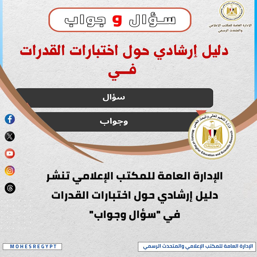 وجه الدكتور أيمن عاشور وزير التعليم العالي والبحث العلمي، بإتاحة كافة الخدمات والمعلومات التي من شأنها التيسير على الطلاب الراغبين في الالتحاق بالكليات التي يُشترط القبول بها اجتياز اختبارات القدرات المؤهلة لها، وذلك في إطار فتح باب التقديم لإجراء اختبارات القدرات لطلاب الثانوية العامة لعام 2025، للالتحاق بالعام الجامعي الجديد 2025/2026، وفي هذا الإطار أعدت الإدارة العامة للمكتب الإعلامي والمتحدث الرسمي للوزارة، دليلًا إرشاديًّا يتكون من (سؤال وجواب) ويتضمن كافة الإجابات عن الأسئلة والاستفسارات التي تساعد الطلاب على معرفة الإجراءات التفصيلية لاختبارات القدرات، من خلال الرابط التالي: