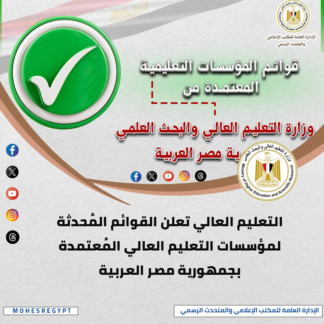 وجه الدكتور أيمن عاشور وزير التعليم العالي والبحث العلمي، بإعلان القوائم المحدثة لمؤسسات التعليم العالي المعتمدة بجمهورية مصر العربية؛ لتوعية وتعريف أولياء الأمور والطلاب بهذه المؤسسات التعليمية المُعتمدة، وفي هذا الإطار تقوم الإدارة العامة للمكتب الإعلامي بالوزارة، بتحديث قوائم مؤسسات التعليم العالي المُعتمدة بجمهورية مصر العربية بشكل دائم؛ بهدف تعريف وتوعية الطلاب وأولياء الأمور بهذه المؤسسات، حيث أنه يتم تحديث هذه القوائم باستمرار من خلال الموقع الإلكتروني وحسابات وزارة التعليم العالي والبحث العلمي الرسمية على مواقع التواصل الاجتماعي التالية:
