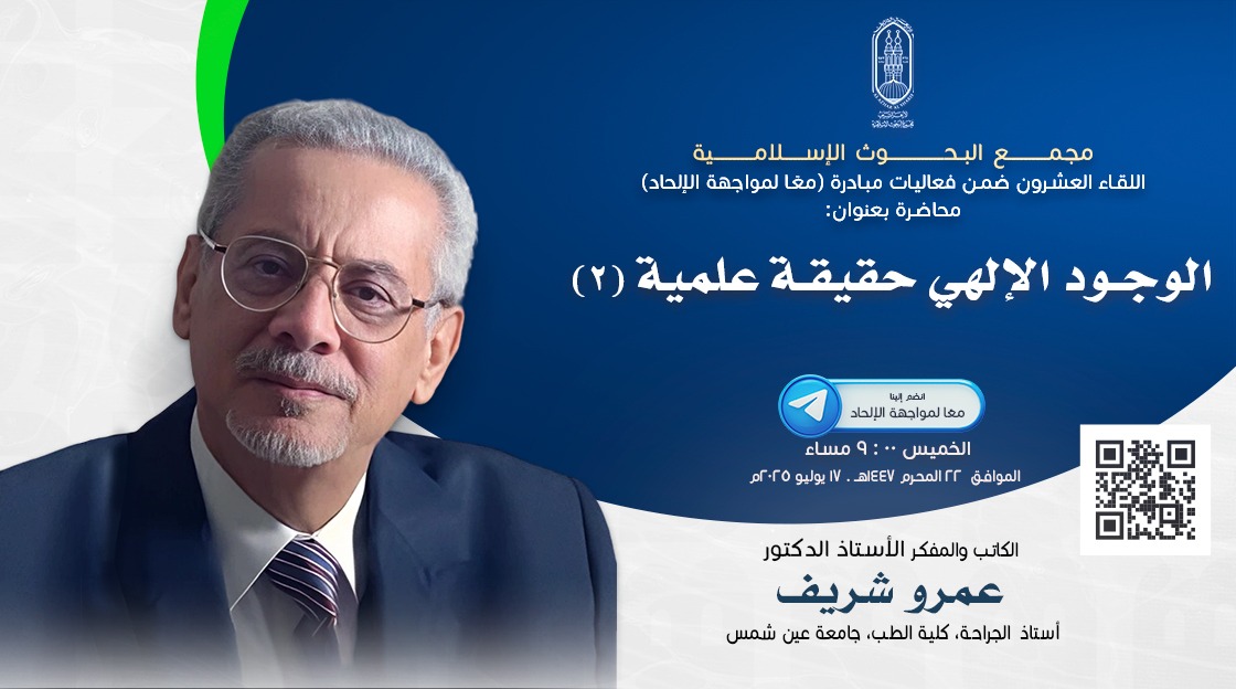 *غدًا.. (البحوث الإسلامية) يعقد اللقاء الـ20 مِن فعاليَّات مبادرة (معًا لمواجهة الإلحاد)* يعقد مجمع البحوث الإسلاميَّة بالأزهر الشريف، في التَّاسعة مِن مساء غد الخميس، اللقاءَ العشرين مِن فعاليَّات مبادرة (معًا لمواجهة الإلحاد). ويستضيف هذا اللقاء -الذي يُعقَد افتراضيًّا عَبْر منصَّة (تليجرام) تحت عنوان: (الوجود الإلهي حقيقة عِلميَّة 2)- الكاتب والمفكِّر أ.د. عمرو شريف، أستاذ الجراحة بكليَّة الطب في جامعة عين شمس ؛ وذلك في إطار الجهود المستمرَّة للأزهر الشريف بجميع قطاعاته بقيادة فضيلة الإمام الأكبر أ.د. أحمد الطيِّب، شيخ الأزهر الشريف، للتصدِّي لظاهرة الإلحاد التي أصبحت تشكِّل خطرًا…