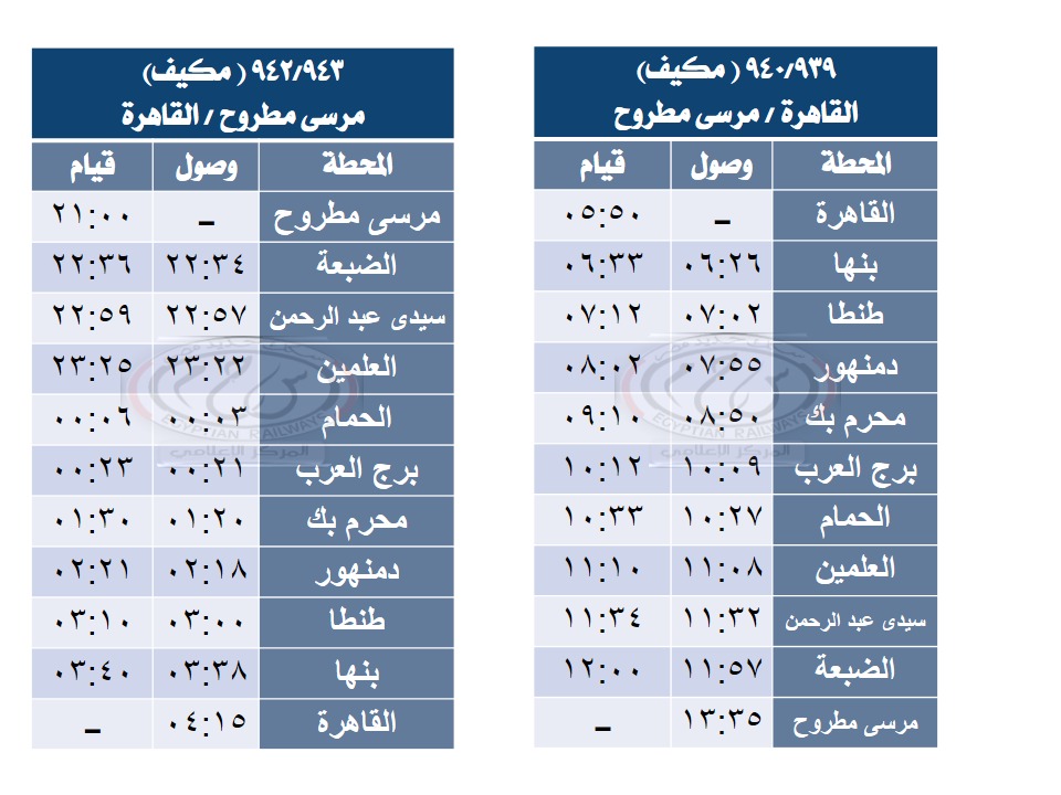 فقد تقرر إعتباراً من يوم السبت الموافق 19 يوليو 2025 تشغيل قطار 939/ 940 القاهرة / مرسى مطروح بعربات ثالثة مكيفة على ان يقوم من القاهرة الساعة 5,50 صباحاً ويصل مرسى مطروح الساعة 1,35ظهراً طبقاً للجدول المرفق وتشغيل قطار 943/ 942 مرسى مطروح / القاهرة بعربات ثالثة مكيفة على ان يقوم من مرسى مطروح الساعة 9,00 مساءً ويصل القاهرة الساعة 4,15 صباح اليوم التالى طبقا للجدول المرفق وتؤكد الهيئة على انها لاتتوانى فى تلبية احتياجات جمهور الركاب طبقا للمتاح