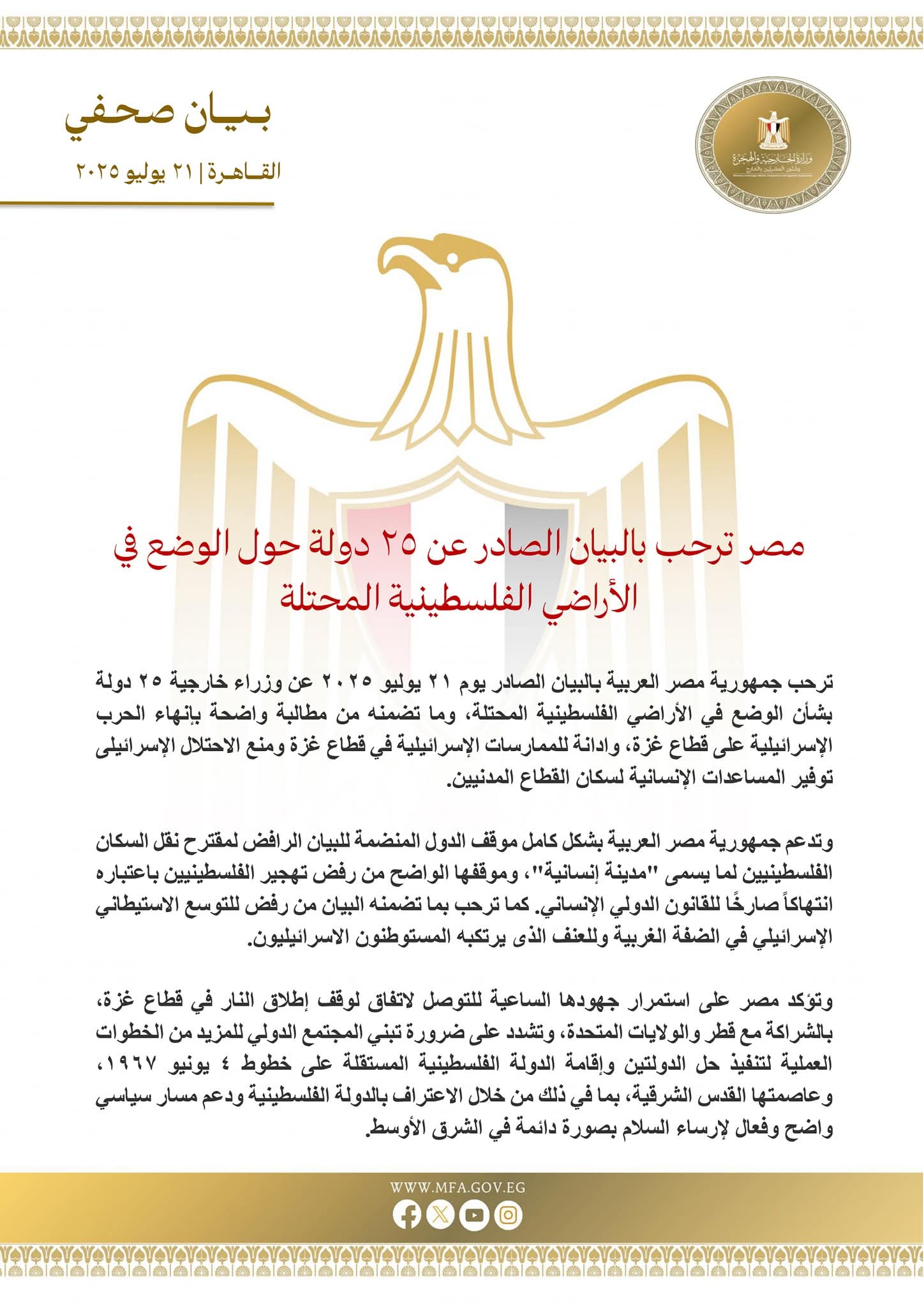 ترحب جمهورية مصر العربية بالبيان الصادر يوم ٢١ يوليو ٢٠٢٥ عن وزراء خارجية ٢٥ دولة بشأن الوضع في الأراضي الفلسطينية المحتلة، وما تضمنه من مطالبة واضحة بإنهاء الحرب الإسرائيلية على قطاع غزة، وادانة للممارسات الإسرائيلية في قطاع غزة ومنع الاحتلال الإسرائيلى توفير المساعدات الإنسانية لسكان القطاع المدنيين.