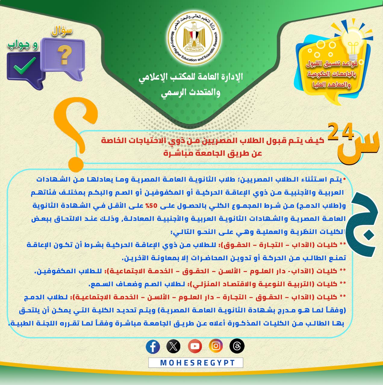التعليم العالي تنشر انفوجرافات توضيحية للتوعية بكيفية تنسيق القبول بالجامعات الحكومية والمعاهد لطلاب الثانوية العامة في “سؤال وجواب”