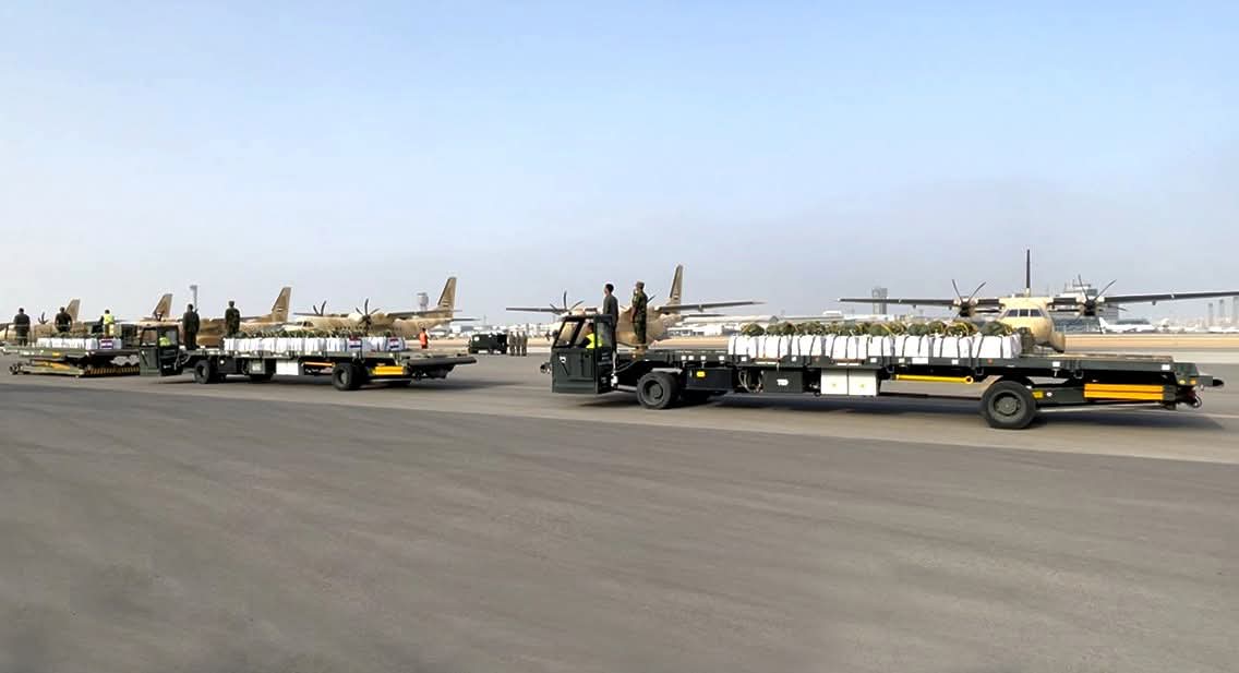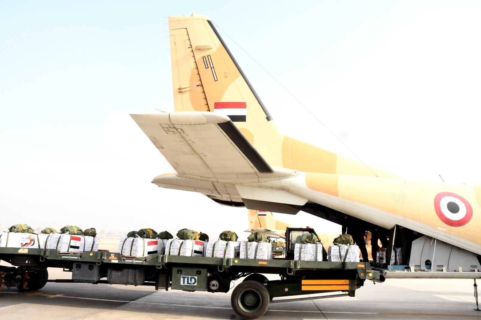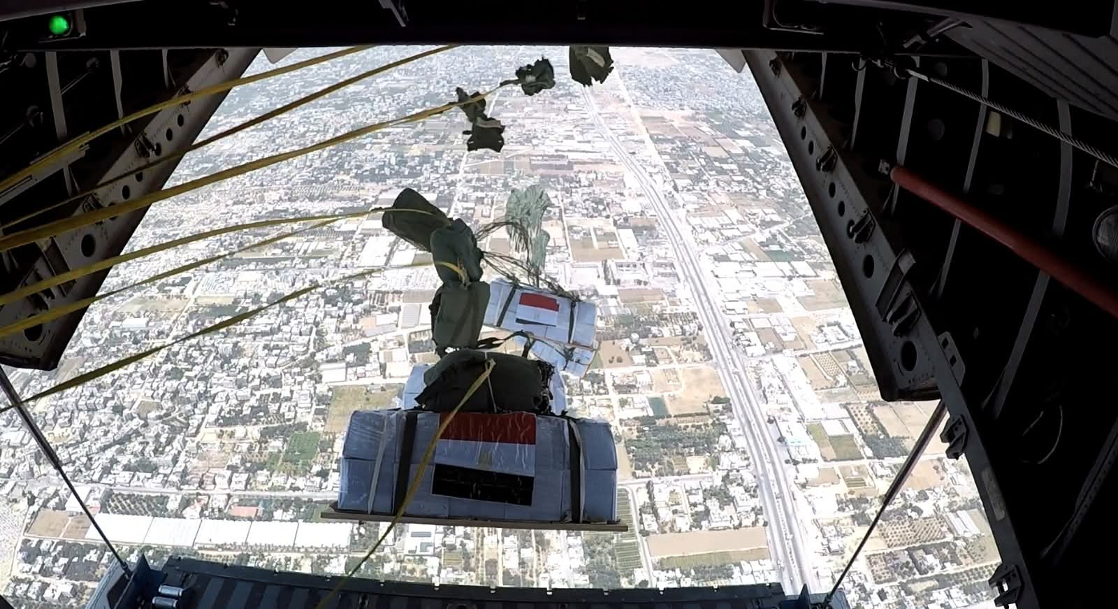 أقلعت 4 طائرات نقل عسكرية من جمهورية مصر العربية محملة بأطنان من المساعدات الغذائية لتنفيذ أعمال الإسقاط الجوى على المناطق التى يصعب الوصول إليها براً بقطاع غزة ، وذلك لتخفيف حدة الأوضاع المعيشية الصعبة ونقص الإحتياجات الإنسانية التى يعانى منها سكان القطاع ، هذا بالتزامن مع إستمرار تقديم المساعدات براً .