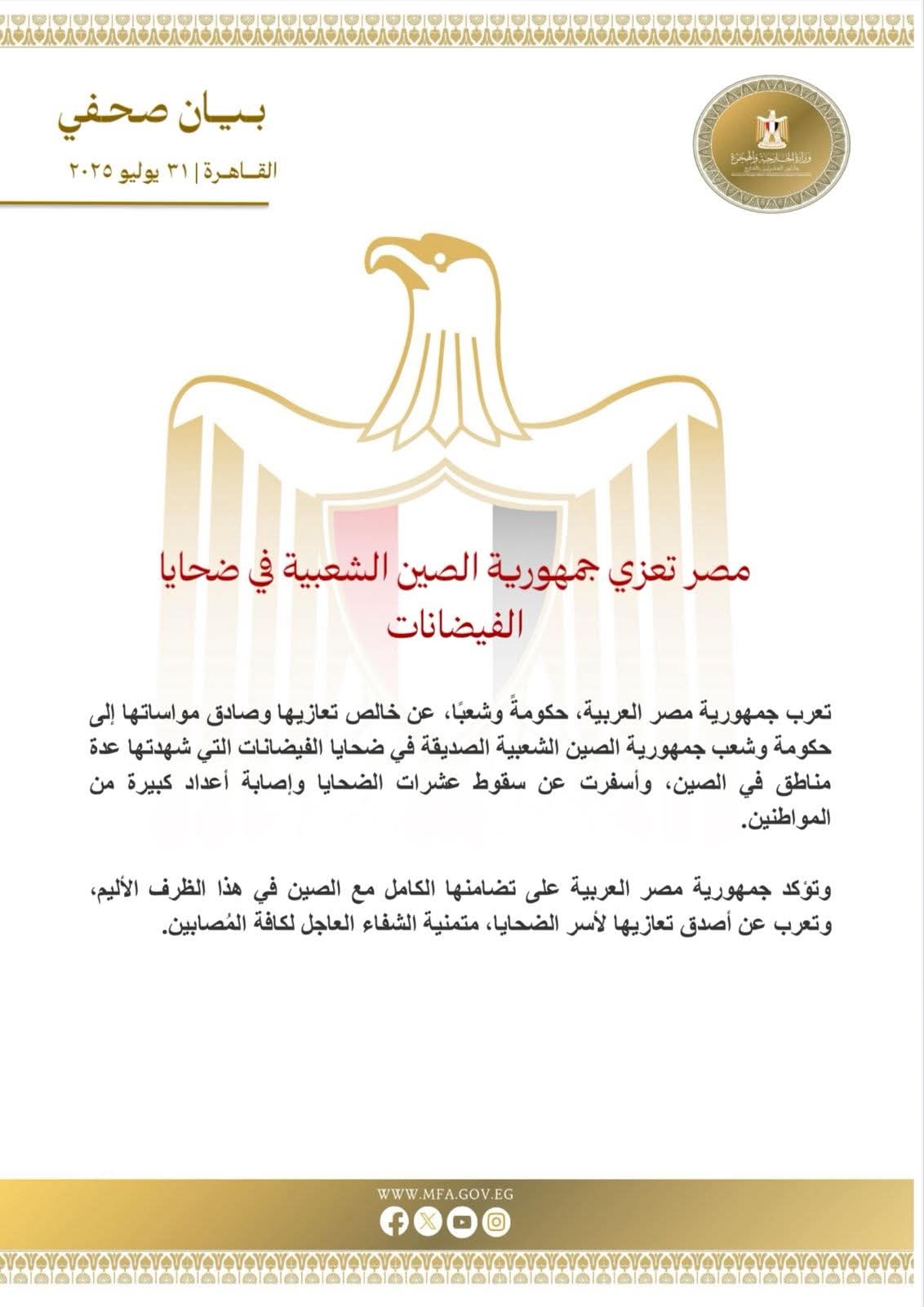 تعرب جمهورية مصر العربية، حكومةً وشعبًا، عن خالص تعازيها وصادق مواساتها إلى حكومة وشعب جمهورية الصين الشعبية الصديقة في ضحايا الفيضانات التي شهدتها عدة مناطق في الصين، وأسفرت عن سقوط عشرات الضحايا وإصابة أعداد كبيرة من المواطنين.