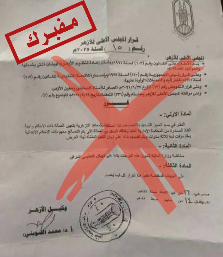 ينفي المركز الإعلامي للأزهر صحة ما يتم تداوله بشأن قرارات مزعومة منسوبة إلى الأزهر، تتعلق بتعيين العمالة المتطوّعة (المنضمة) للعمل بالمعاهد التي تم إنشاؤها بالجهود الذاتية، مؤكدا أن هذه القرارات لم تصدر عن أي جهة رسمية في الأزهر، وأن ما يتم تداوله في هذا الشأن عارٍ تمامًا من الصحة، ويهدف إلى الاحتيال على المواطنين البسطاء واستغلال حاجاتهم.