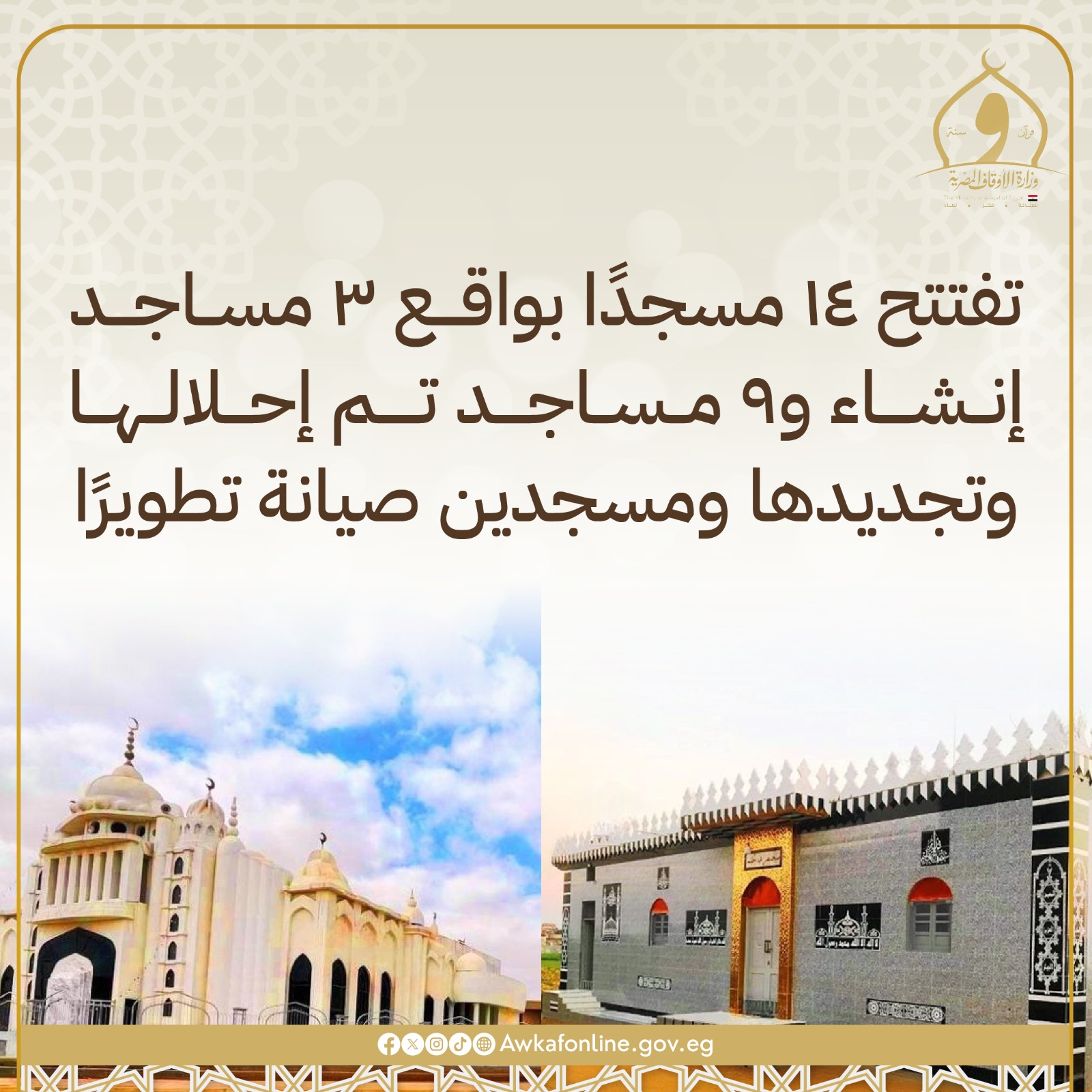 افتتحت وزارة الأوقاف ١٤ مسجدا على مستوى الجمهورية، بواقع ٣ مساجد إنشاء وبناء جديد، و٩ مساجد تم إحلالها وتجديدها بالكامل، ومسجدين صيانة وتطوير.