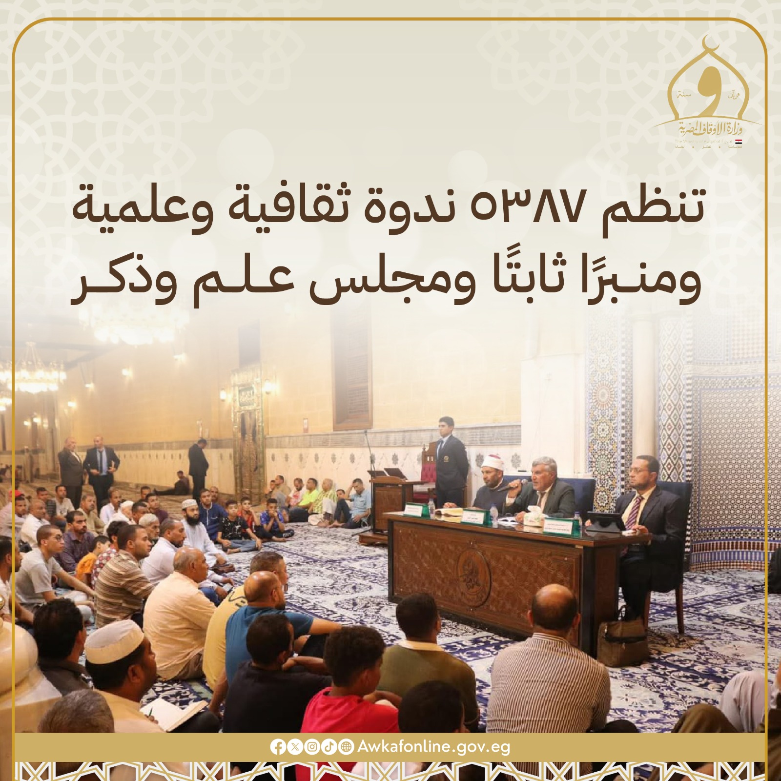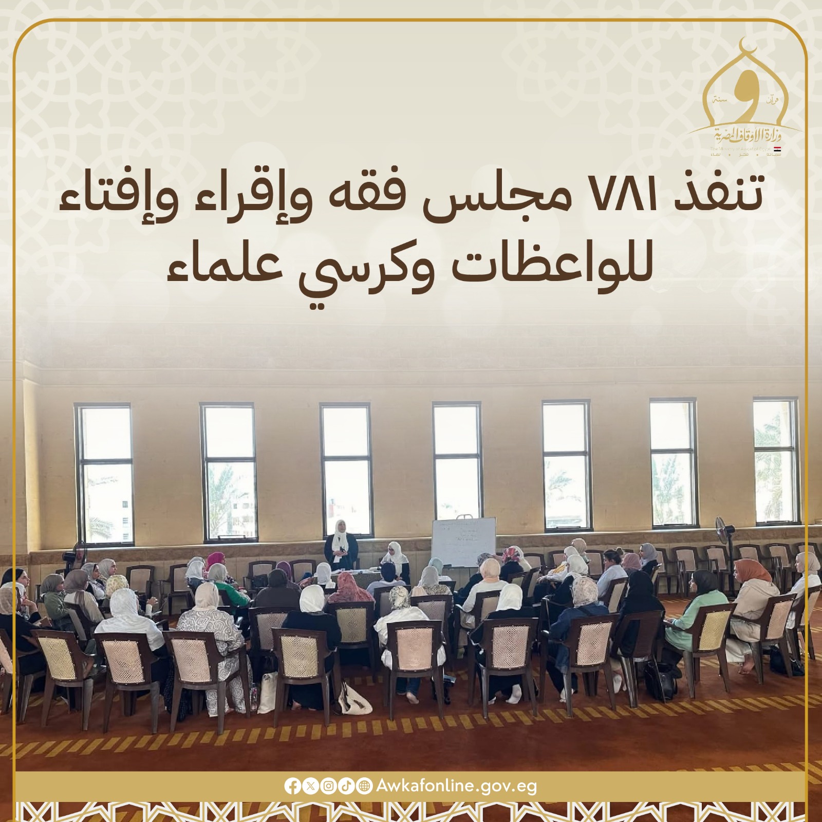 نفَّذت وزارة الأوقاف ٧٨١ مجلس فقه، وإقراء، وإفتاء للواعظات، وكرسي علماء، وملتقى فكري، وخاطرة واعظات؛ ٢١٣٧ درسًا منهجيًّا للأئمة والواعظات، وأسبوعًا ثقافيًّا، وقافلة دعوية؛ إلى جانب تنفيذ البرنامج التثقيفي للطفل في ٢٢٠٣٠ مسجدًا بجميع المديريات؛ إضافة إلى ٥٣٨٧ ندوة ثقافية وعلمية ومنبرًا ثابتًا، ومجلس علم وذكر، وصحة إنجابية، ولقاء الجمعة للطفل.
