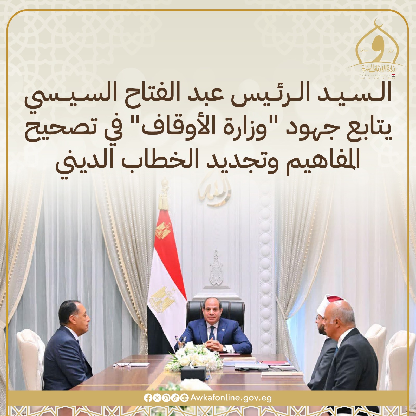 السيد الرئيس عبد الفتاح السيسي يتابع جهود “وزارة الأوقاف” في تصحيح المفاهيم وتجديد الخطاب الديني وتعزيز الوعي الوطني.