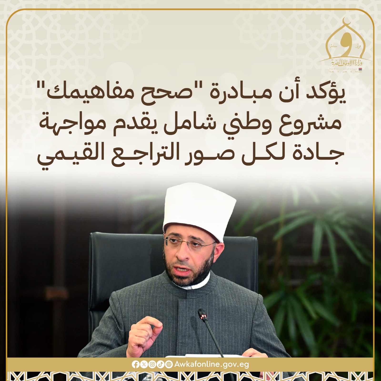 أكّد الأستاذ الدكتور أسامة الأزهري، وزير الأوقاف – رئيس المجلس الأعلى للشئون الإسلامية، أن مبادرة “صحح مفاهيمك” تُمثِّل مشروعًا وطنيًّا شاملًا، يأتي استكمالًا للجهود المصرية الرَّامية إلى مواجهة فكر الإرهاب والتطرف من ناحية، بالمواكبة مع انطلاقة جديدة لمسار آخر، يقوم على تحصين المجتمع من الأفكار الهدّامة التي تستهدف استقراره وتماسكه.
