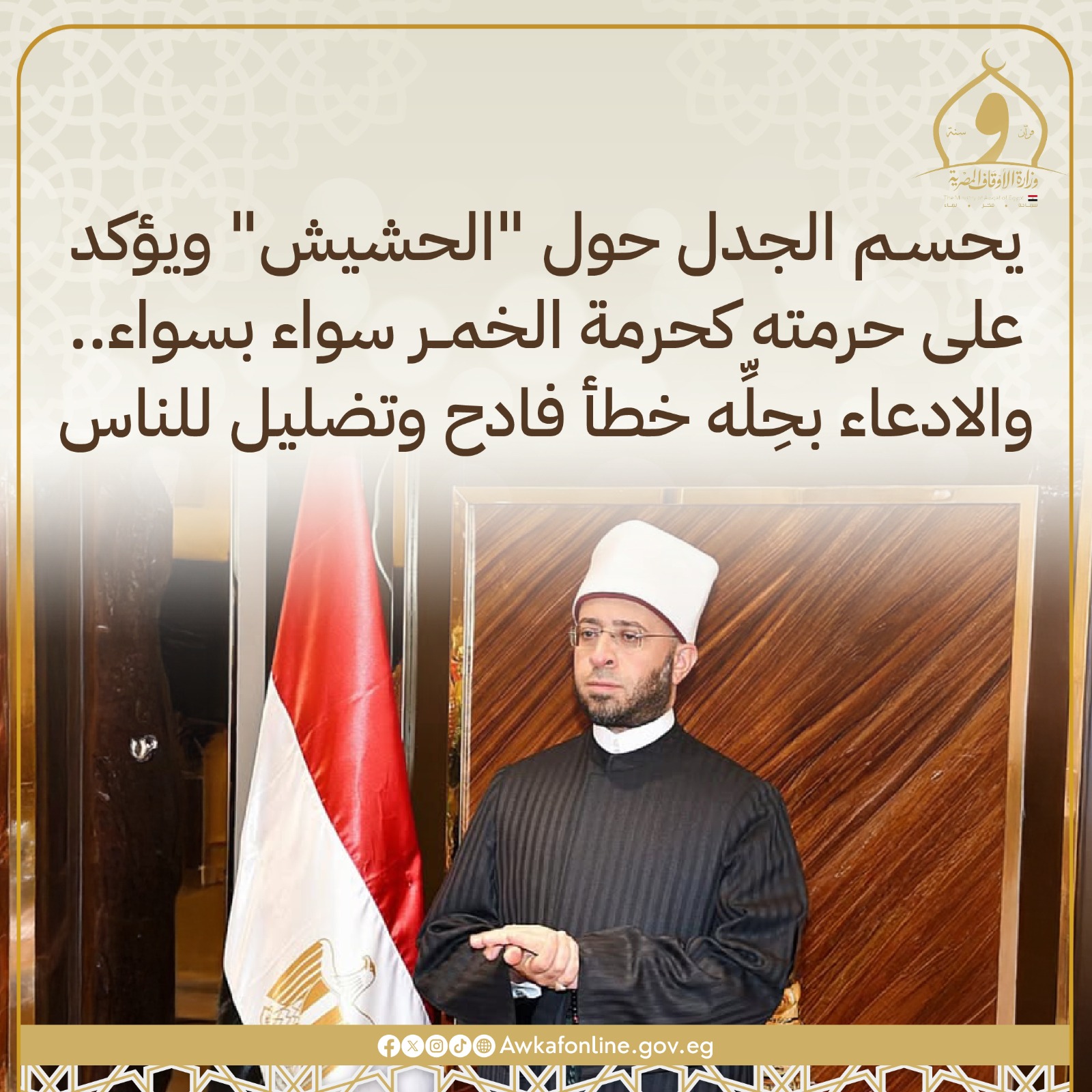 وزير الأوقاف: الحشيش حرام كحرمة الخمر سواء بسواء.. والادعاء بحِلِّه خطأ فادح وتضليل للناس.