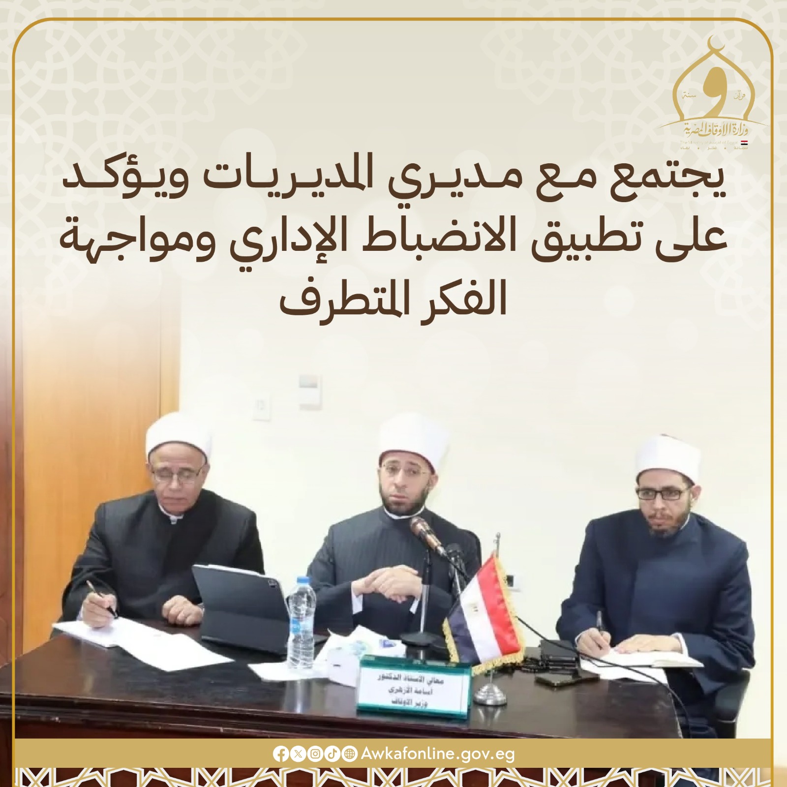 وزير الأوقاف في اجتماع موسع بمديري المديريات: التشديد على الانضباط الإداري التام… ومواجهة الفكر المتطرف وكل تحديات شعب مصر العظيم هو مهمتنا الكبرى.