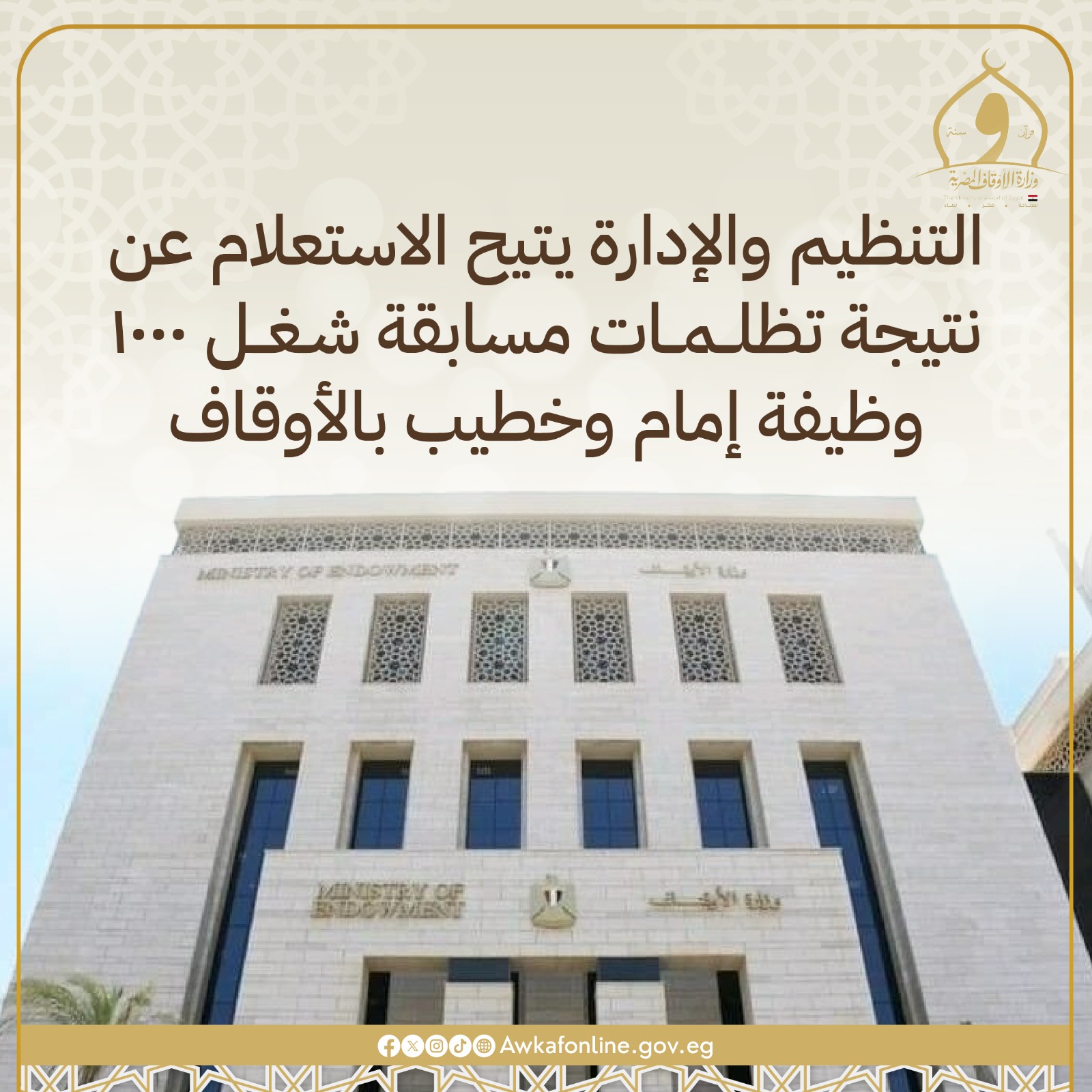 التنظيم والإدارة يتيح الاستعلام عن نتيجة تظلمات مسابقة شغل ١٠٠٠ وظيفة إمام وخطيب بالأوقاف.