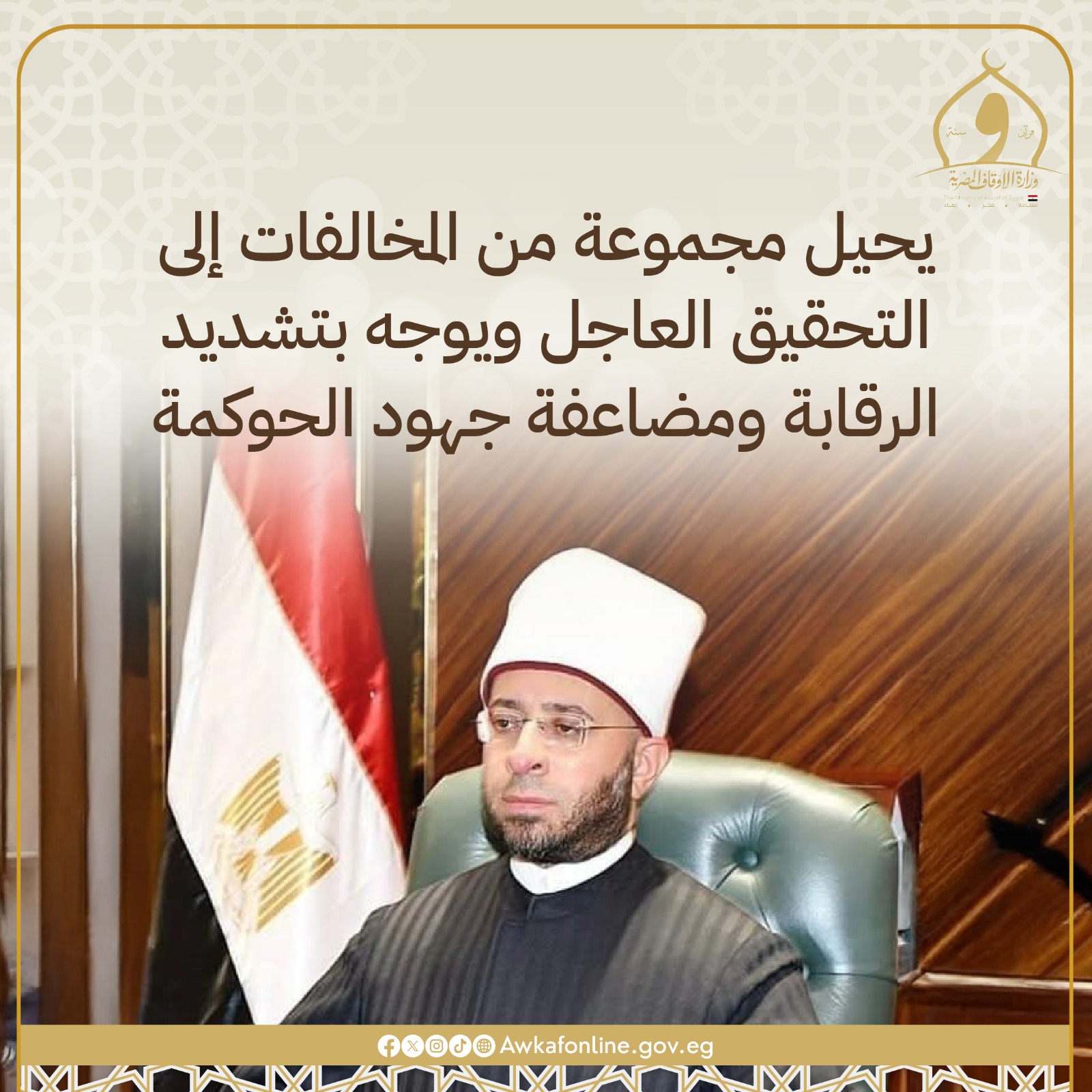 وزير الأوقاف يحيل مجموعة من المخالفات إلى التحقيق العاجل ويوجه بتشديد الرقابة ومضاعفة جهود الحوكمة.