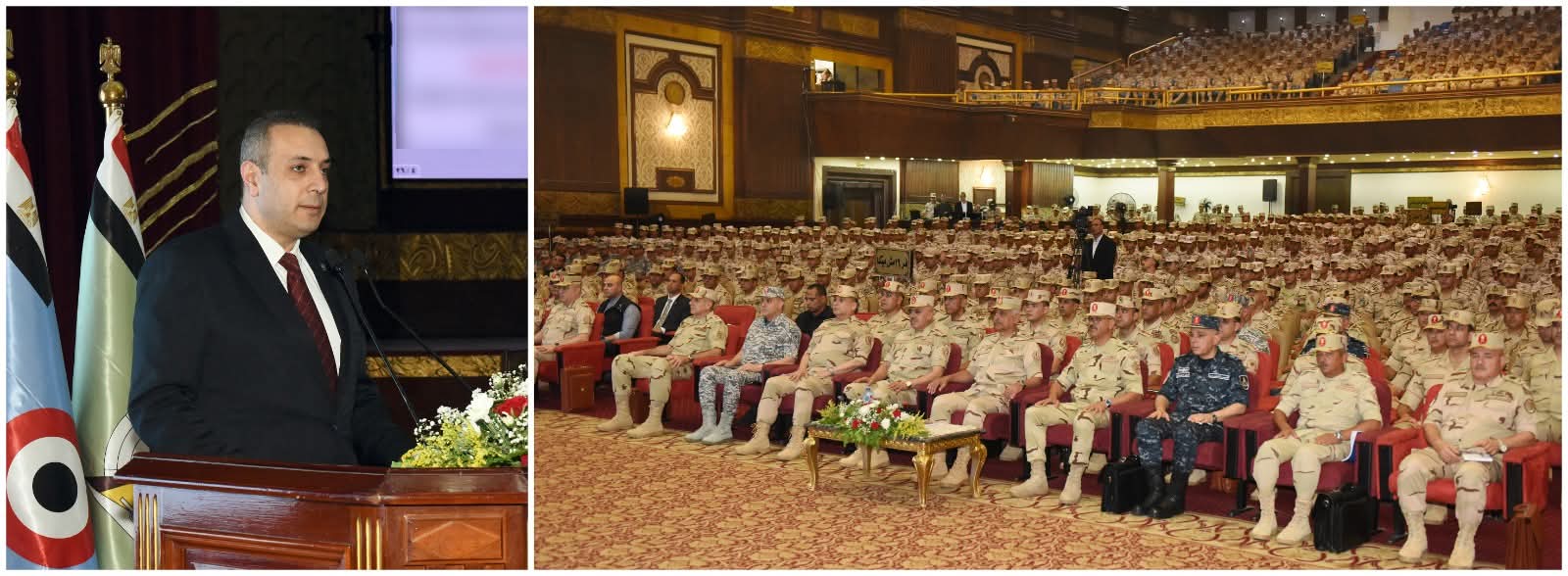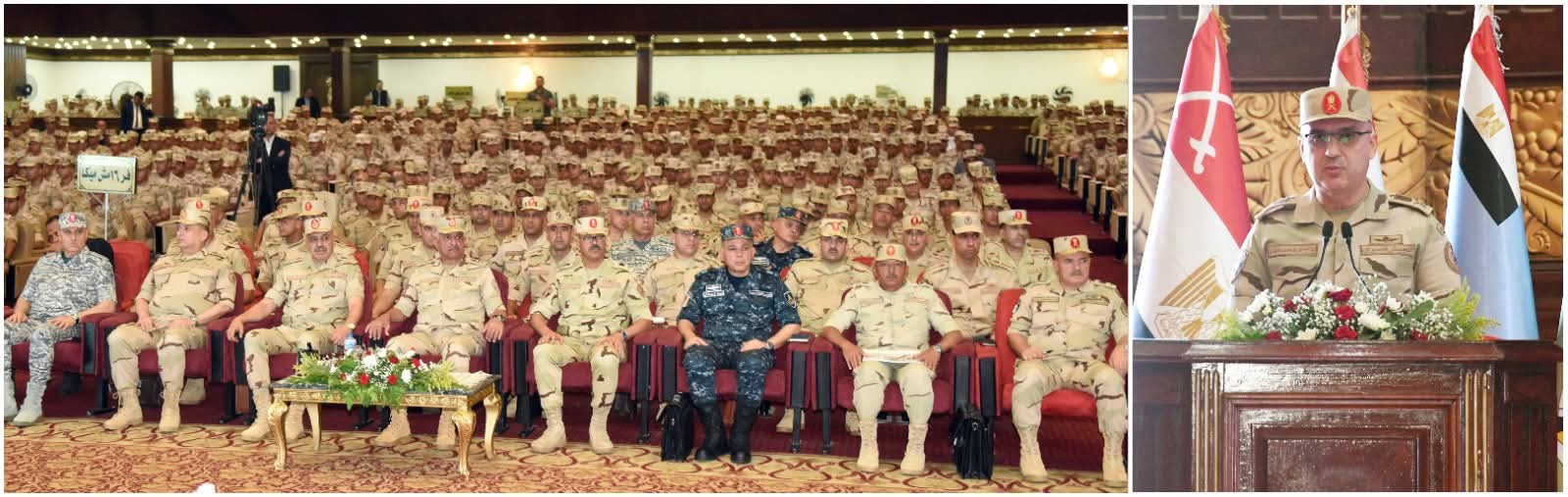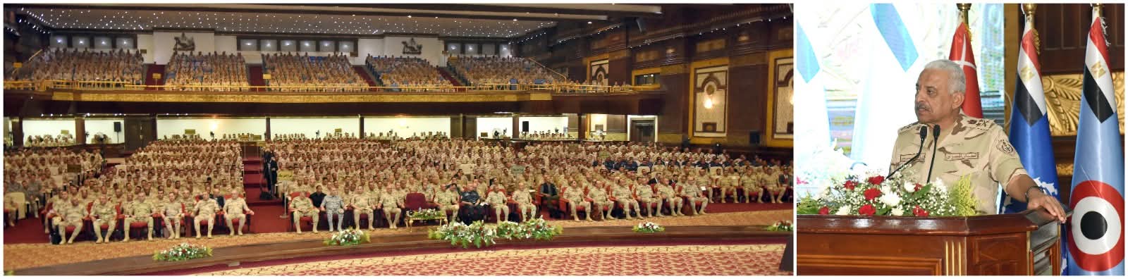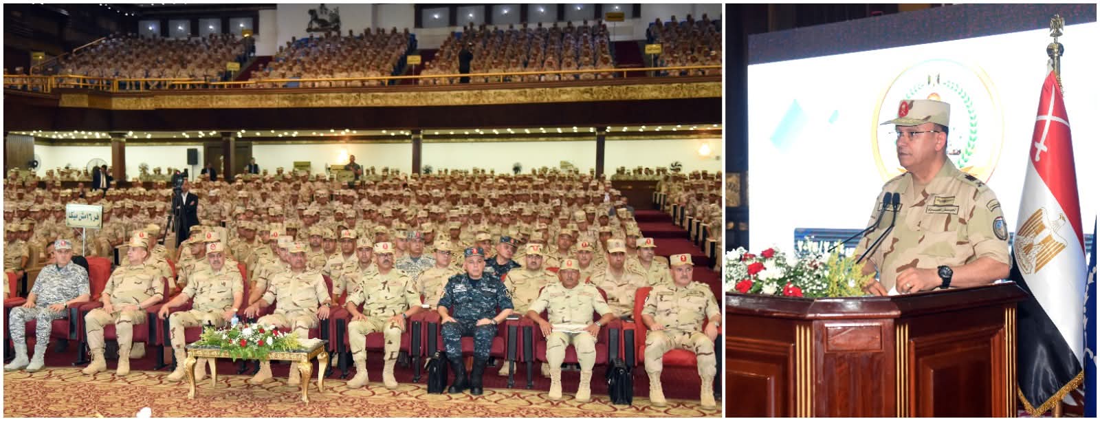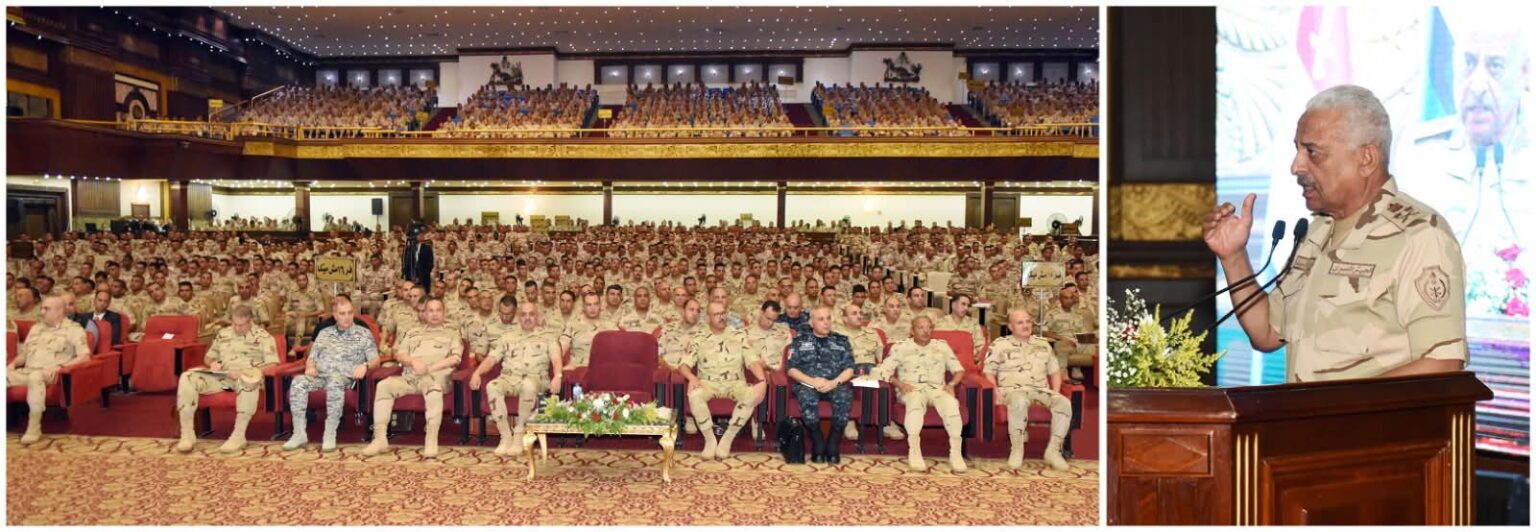 وألقى الفريق أول / عبد المجيد صقر القائد العام للقوات المسلحة وزير الدفاع والإنتاج الحربى كلمة نقل خلالها تحيات وتقدير السيد الرئيس / عبد الفتاح السيسى رئيس الجمهورية القائد الأعلى للقوات المسلحة للحضور ، مشيراً إلى أن القيادة العامة للقوات المسلحة حريصة على الإهتمام بالفرد المقاتل وتطوير آداءه القتالى بما يمكنه من تنفيذ كافة المهام التى توكل إليه بكفاءة وإقتدار تحت مختلف الظروف ، وطالب القائد العام للقوات المسلحة المقاتلين أن يكونوا قدوة فى الإنضباط الذاتى والوصول إلى أعلى مستويات الجاهزية القتالية للحفاظ على أمن الوطن وإستقراره مهما كلفهم ذلك من تضحيات ، كما شاركهم تناول وجبة الغداء مثنياً على الروح المعنوية العالية للمقاتلين وحرصهم على بذل الغالى والنفيس لحماية الوطن وصون مقدراته .