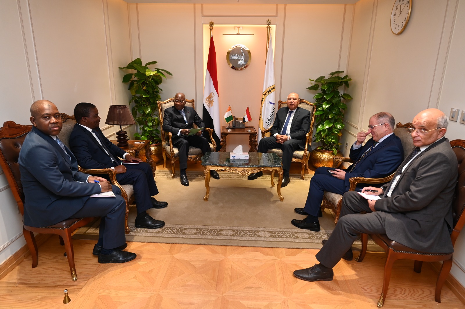 نائب رئيس مجلس الوزراء للتنمية الصناعية وزير الصناعة والنقل يستقبل وزير الخارجية والتكامل الافريقي والايفواريين بالخارج بجمهورية كوت ديفوار لبحث أوجه التعاون المشترك في مجالي الصناعة والنقل