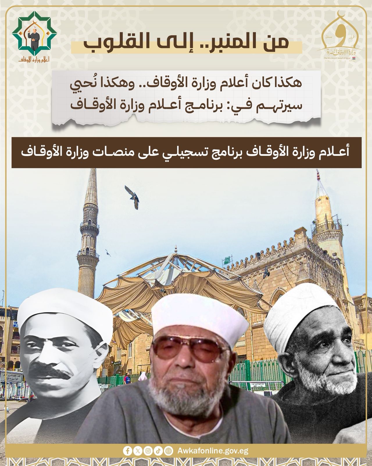 جعلت الإمام قدوة والخطيب رمزًا.. وزارة الأوقاف تطلق برنامج “أعلام وزارة الأوقاف” تطلق وزارة الأوقاف اليوم الجمعة 15 أغسطس 2025م برنامجًا علميًّا جديدًا بعنوان “أعلام وزارة الأوقاف”، يسلط الضوء على نخبة من أعلام الخطابة والدعوة الذين أضاءوا منابر مصر والعالم الإسلامي. يستعرض البرنامج حياتهم ومواقفهم الدعوية وجهودهم في نشر صحيح الدين، مقدمًا رسالة وعي لتعريف الأجيال الجديدة بقامات وزارة الأوقاف الذين حملوا أمانة الكلمة، وجعلوا من الإمام قدوة ومن الخطيب رمزًا. ويتناول البرنامج سير الأئمة والخطباء الذين كانوا صوت الوعي والرشد والعلم وسط الجماهير، ويقدم نماذج واقعية…
