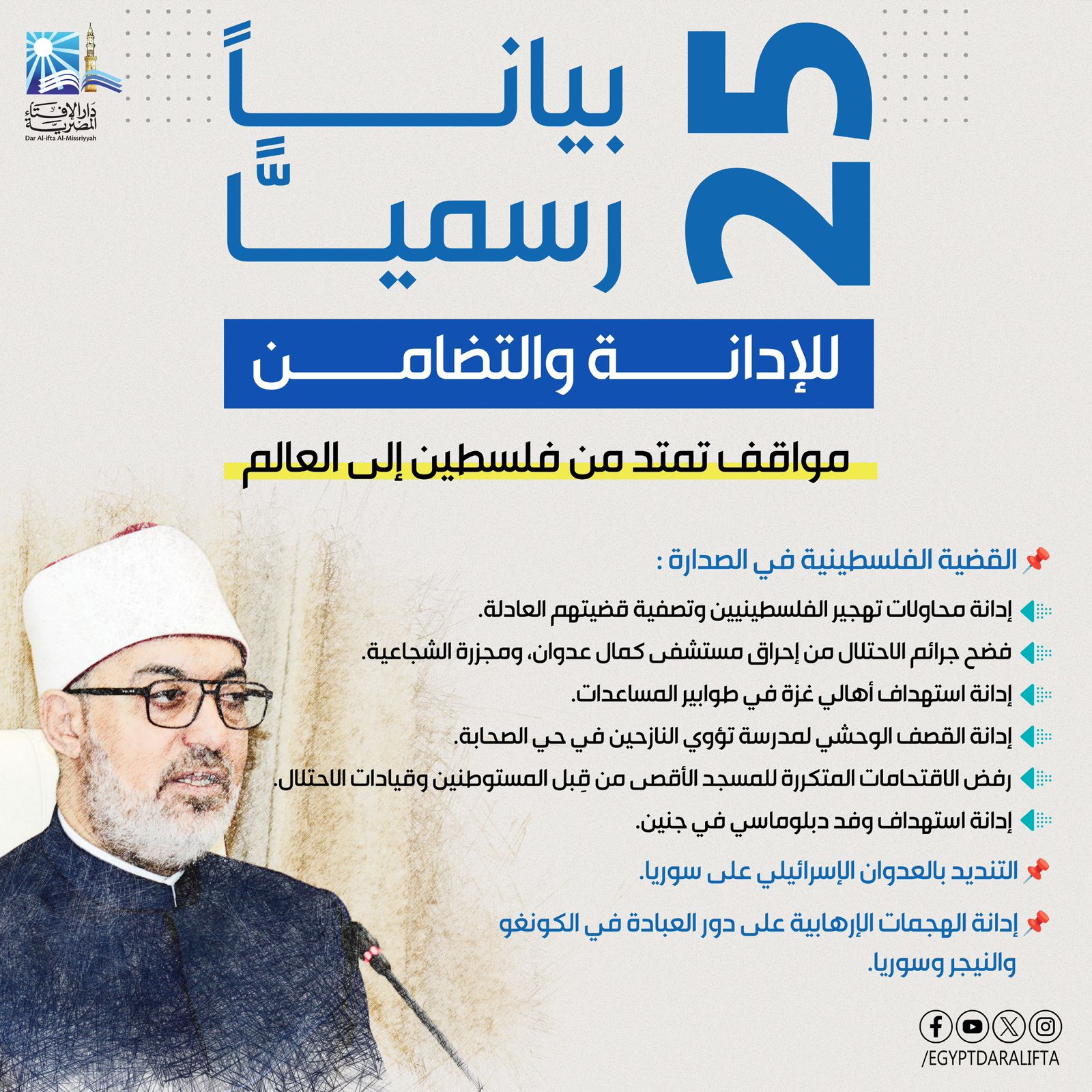 دار الإفتاء المصرية في عهد فضيلة الأستاذ الدكتور نظير محمد عياد تصدر مايزيد عن 25 بيانًا لإدانة الظلم ونصرة القضايا الإنسانية