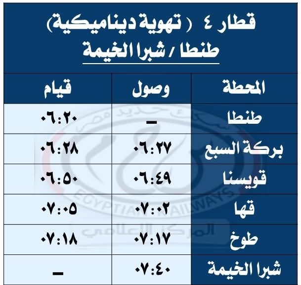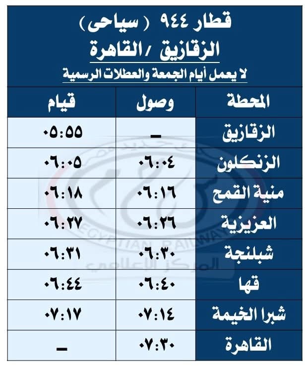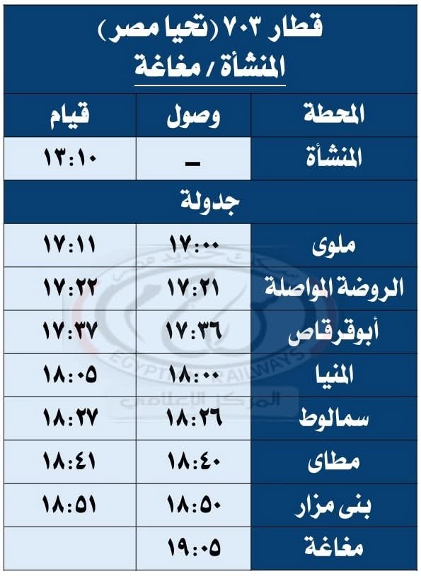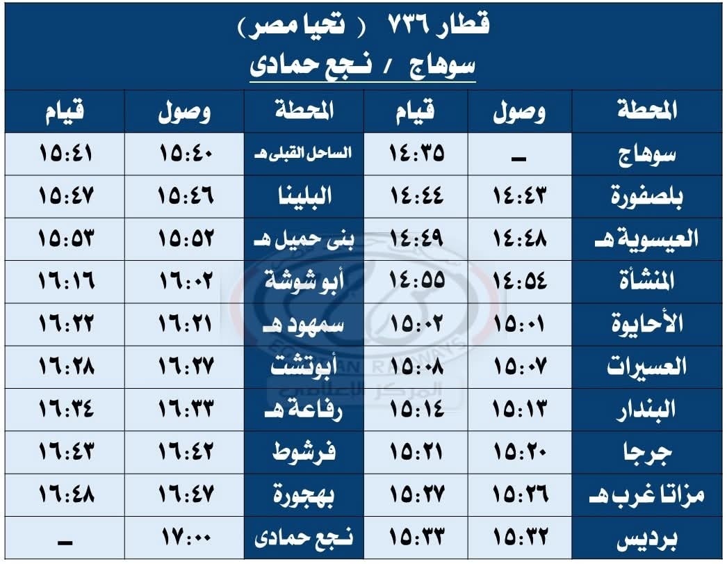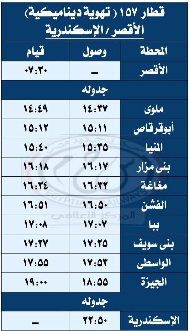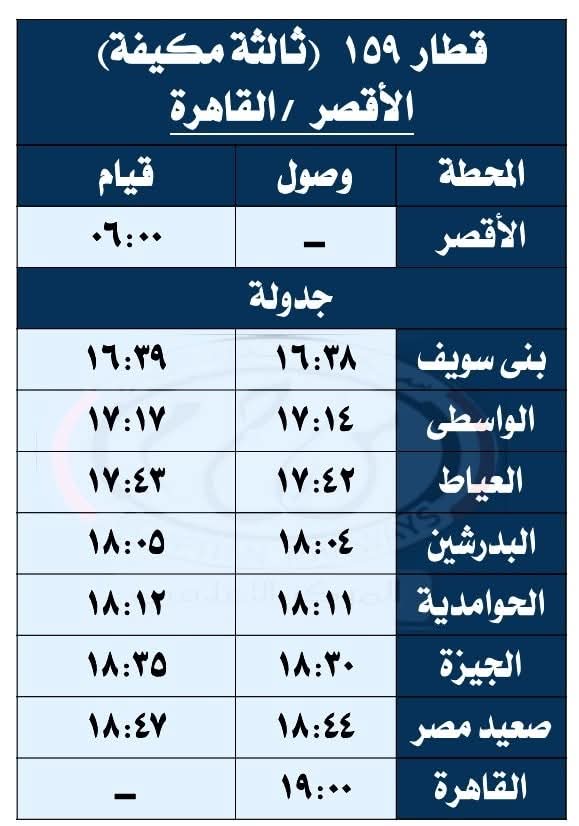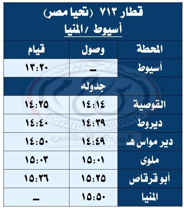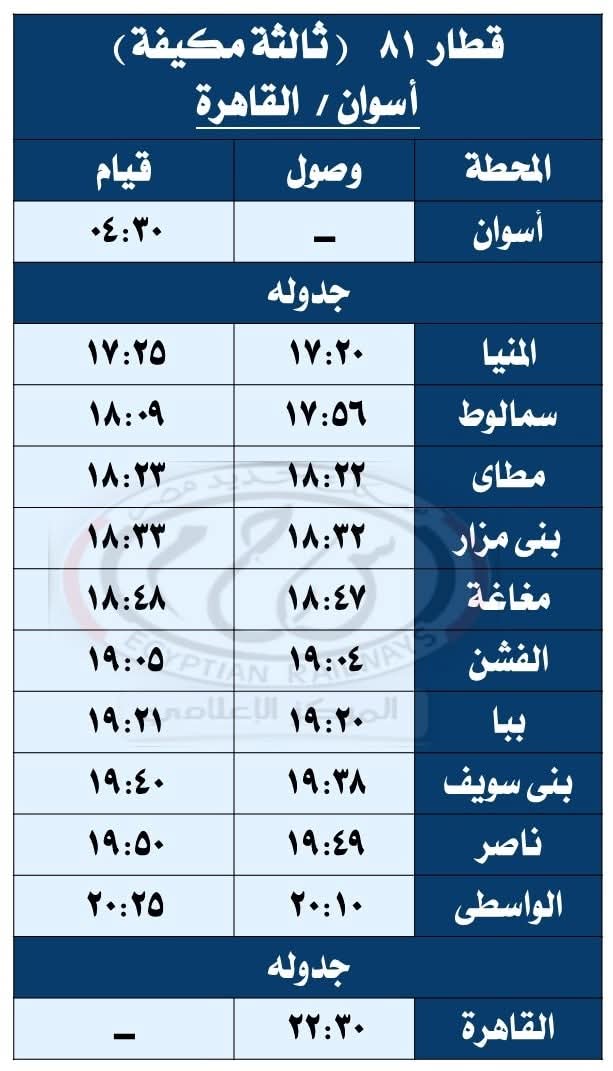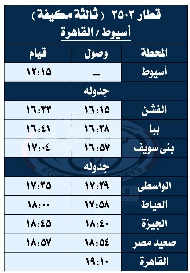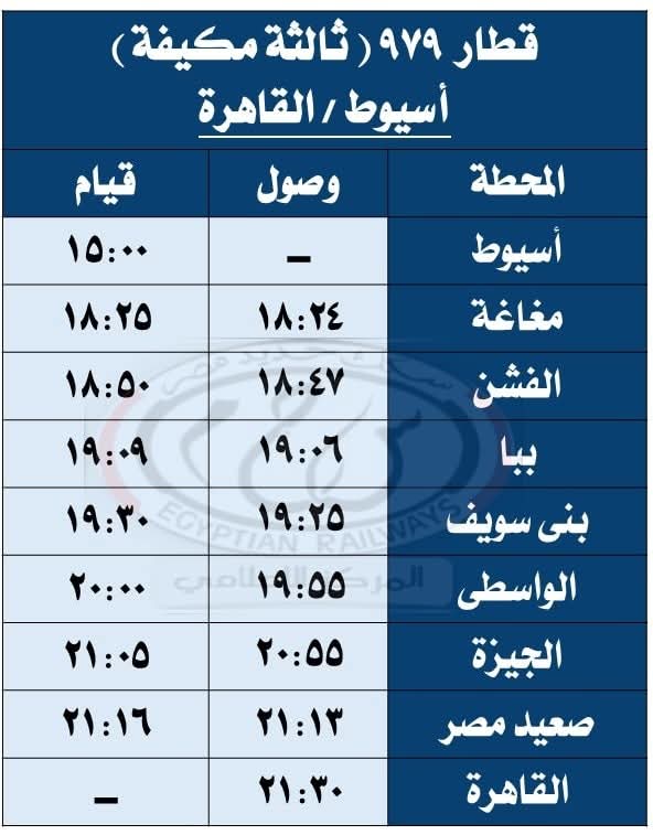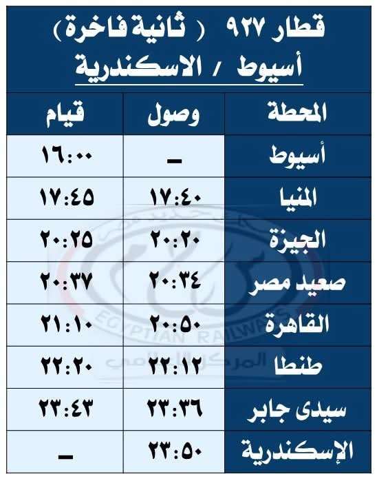 حيث تقرر اعتباراً من يوم السبت الموافق 27 / 9 / 2025 تشغيل قطار 930 ( ثانية فاخرة ) من القاهرة إلى أسيوط حيث يقوم من محطة القاهرة الساعة 08:30 ويصل أسيوط الساعة 13:20 طبقاً للجدول المرفق ، على أن يعود بقطار 929 ( ثانية فاخرة ) حيث يقوم من محطة أسيوط الساعة 13:40 ويصل القاهرة محطة القاهرة الساعة 18:30 طبقاً للجدول المرفق .