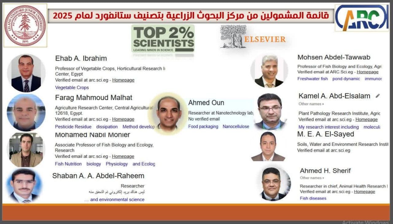 تقدم علاء فاروق، وزير الزراعة واستصلاح الأراضي، بخالص التهنئة والتقدير لـ تسعة باحثين من مركز البحوث الزراعية، والذين تم إدراجهم ضمن القائمة السنوية المرموقة لجامعة ستانفورد الأمريكية بالتعاون مع مؤسسة السفير العالمية، والتي تضم أفضل 2% من العلماء الأكثر تأثيرًا على مستوى العالم.