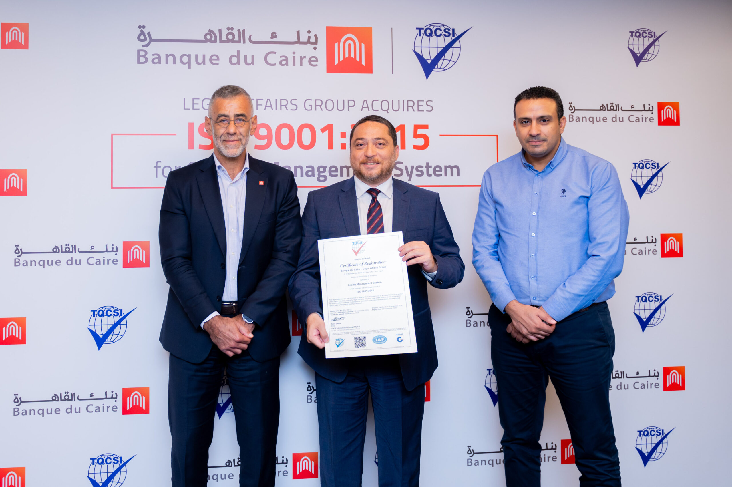 تأكيداً لحرصة المستمر على تطبيق أعلى معايير الجودة والتميز المؤسسي، أعلن بنك القاهرة عن حصول مجموعة الشئون القانونية بالبنك على شهادة الأيزو ISO 9001:2015 في نظام إدارة الجودة، والممنوحة من شركة TQCSI International Pty Ltd، إحدى الجهات العالمية المعتمدة في مجال منح شهادات الجودة.
