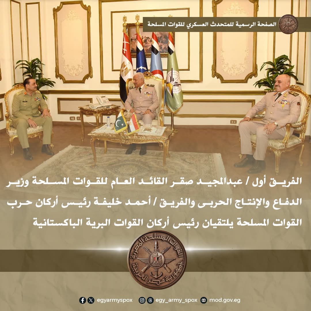 الفريق أول عبدالمجيد صقر القائد العام للقوات المسلحة وزير الدفاع والإنتاج الحربى والفريق أحمد خليفة رئيس أركان حرب القوات المسلحة يلتقيان رئيس أركان القوات البرية الباكستانية
