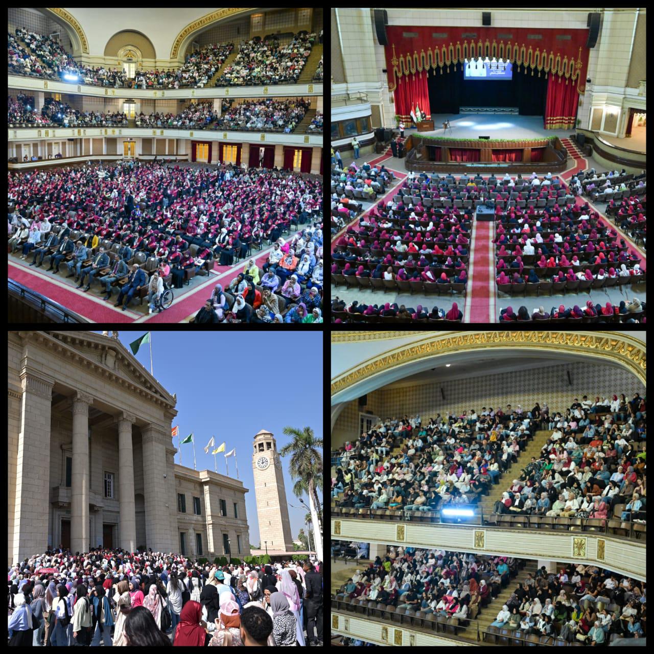 شباب جامعة القاهرة يشغلون كامل مقاعد قاعة الاحتفالات الكبرى في لقاء الداعية مصطفى حسني حول الخطاب الديني وبناء الوعي لدى الشباب.