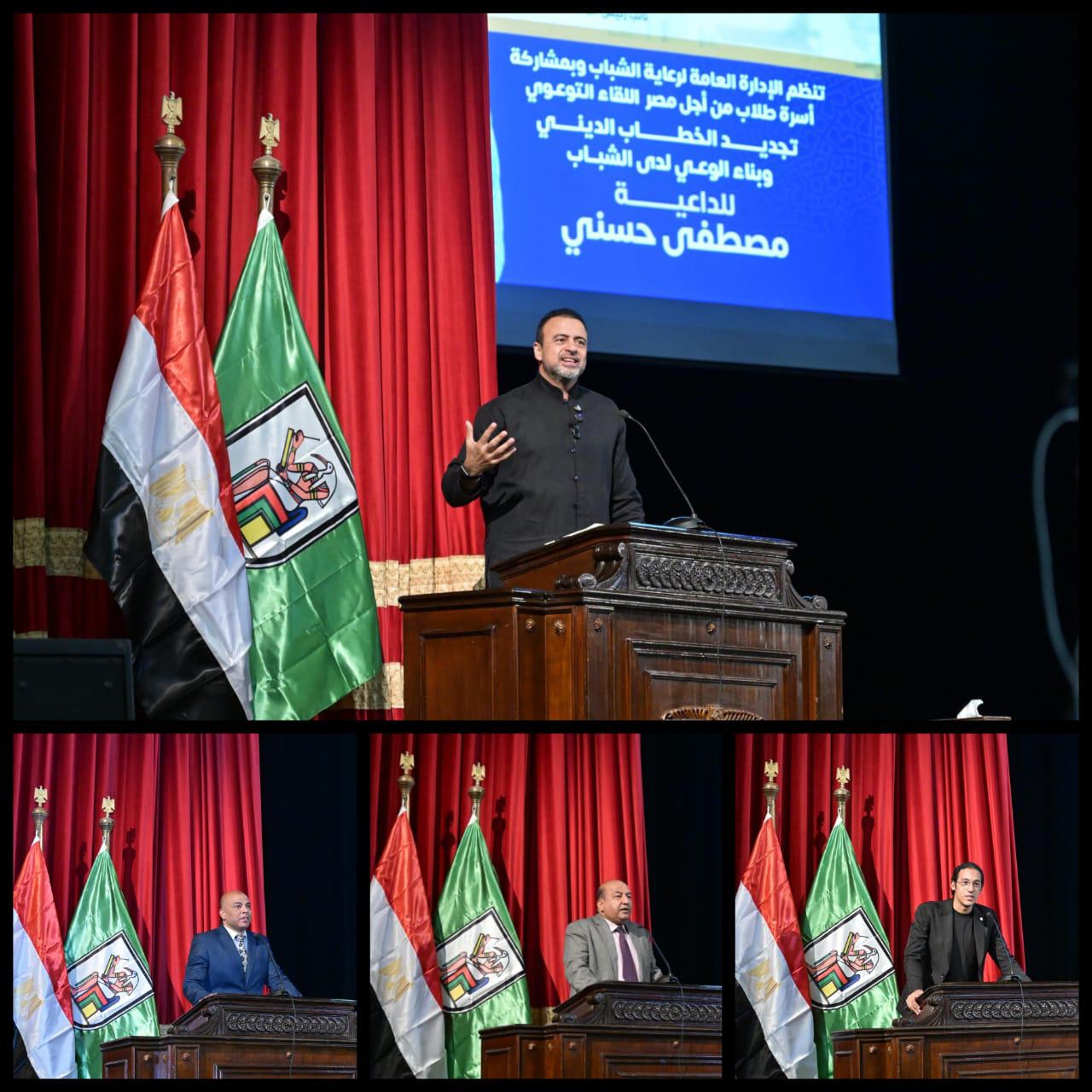 شهدت قاعة الاحتفالات الكبرى بجامعة القاهرة تحت رعاية وحضور د.محمد سامي عبدالصادق رئيس الجامعة، وإشراف د.أحمد رجب نائب رئيس الجامعة لشئون التعليم والطلاب، اللقاء التوعوي حول الخطاب الديني وبناء الوعي لدى الشباب، والذي حاضر خلاله الداعية مصطفى حسني، ونظمته الإدارة العامة لرعاية الشباب بجامعة القاهرة بمشاركة أسرة طلاب من أجل مصر.